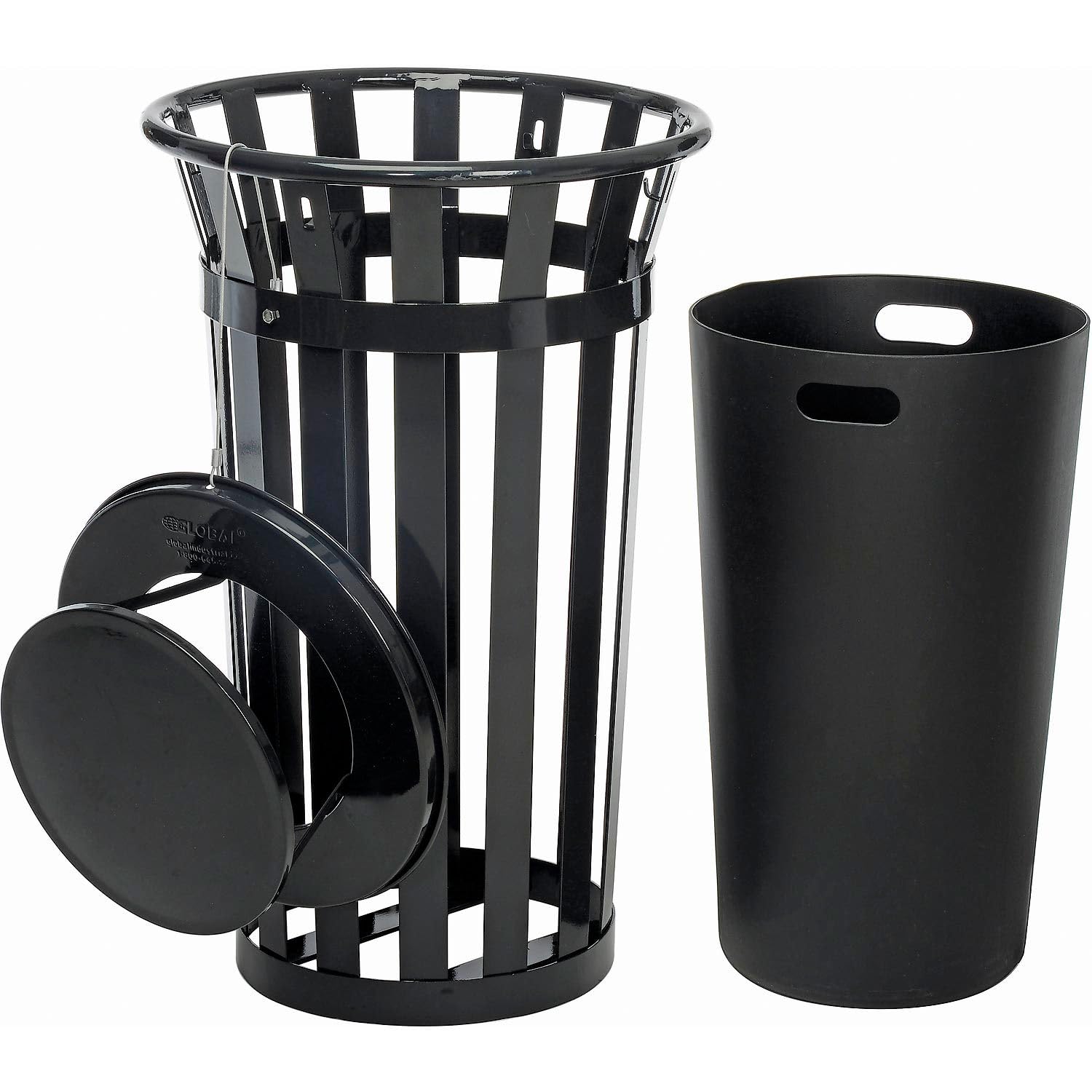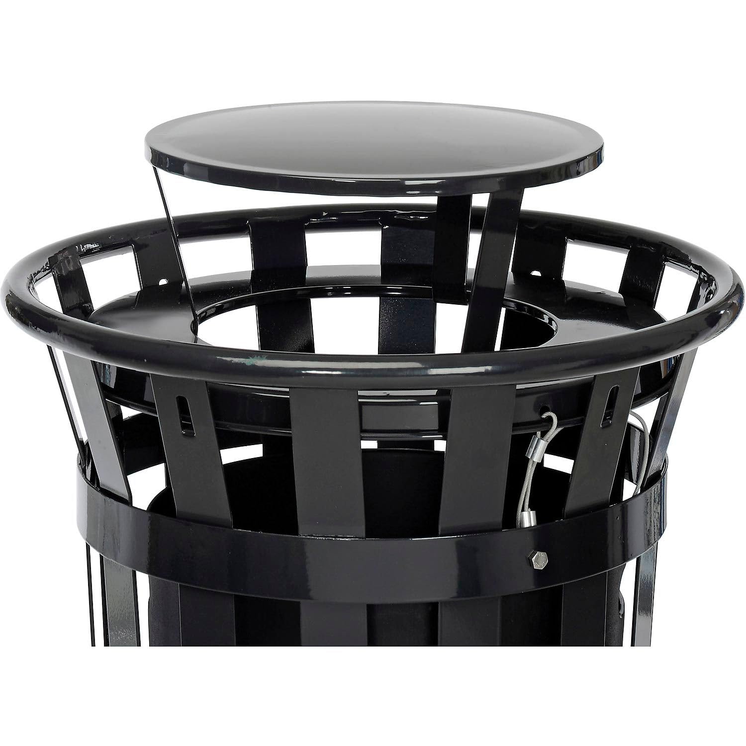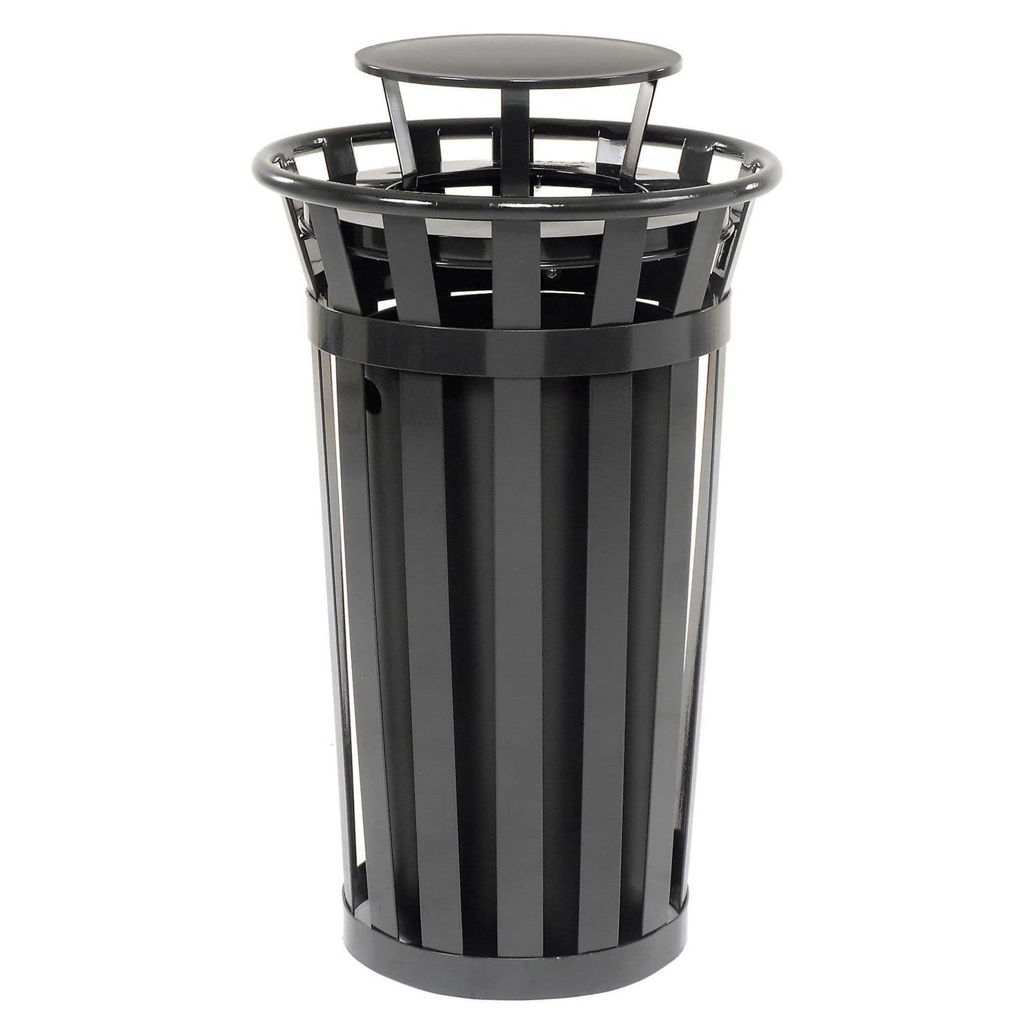 Global Industrial 24 Gallon Heavy-Duty Outdoor Metal Slatted Round Trash Receptacle with Rain Bonnet Lid, Powder Coat Finish, 23" Diameter x 41-3/4"H, Black