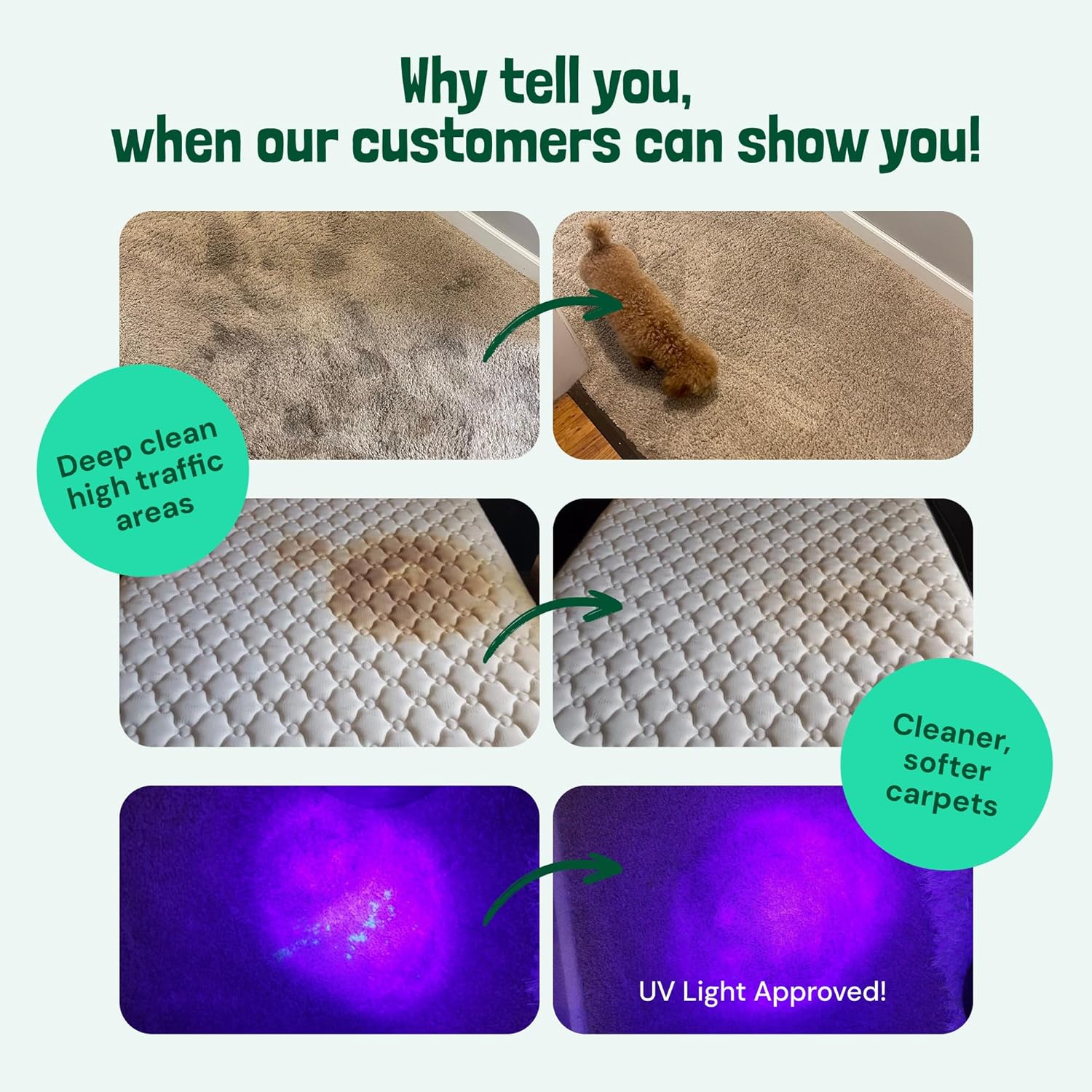 - Pet and Family Friendly: Our pet carpet cleaner solution is crafted with clean ingredients, ideal for homes with pets and kids. Feel confident using this carpet cleaner for pets, knowing it's safe for your loved ones