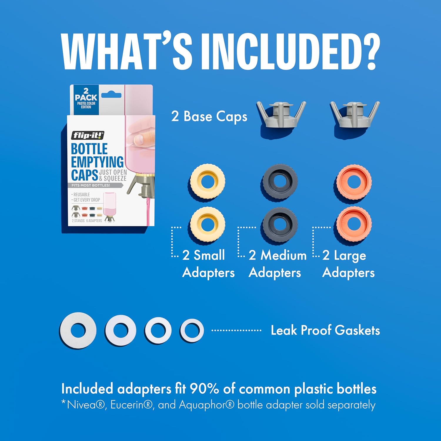 Flip-It! 2-Pack Premium Bottle Emptying Kit – No more wasted product - Fits most plastic bottles – Get out every drop of Shampoos, Lotions, & More – 2 Base Caps, 6 Adapters – Pastel Color Edition