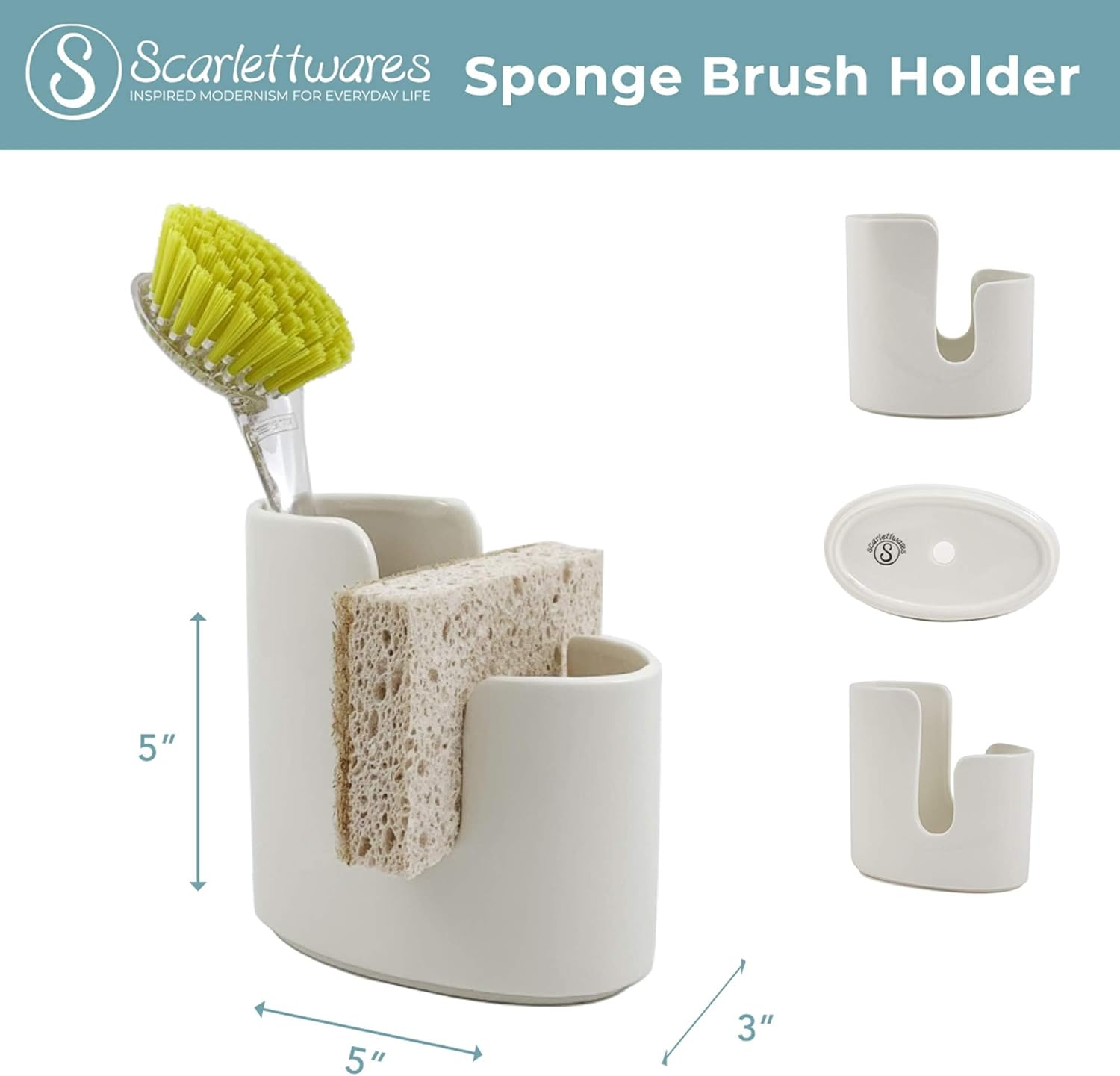 Kitchen Sink Caddy Dish Sponge Holder and Scrub Brush Dish Wand Holder Ceramic White Farmhouse Modern