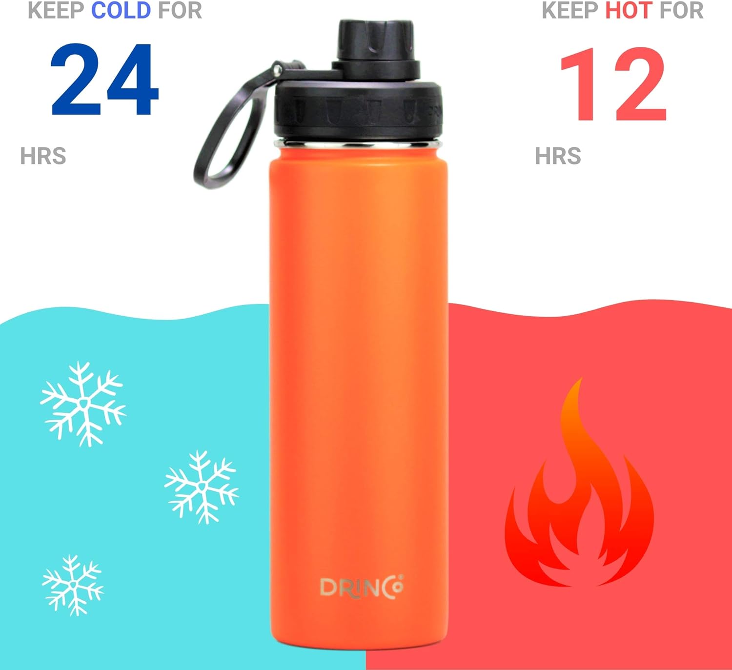 DRINCO Stainless Steel Water Bottle Spout Lid Vacuum Insulated Double Wall Water Bottle Wide Mouth (40oz 32oz 22oz 18oz 14oz) Leak Proof Keep Cold Sport Camping Hiking (22 oz, 22oz Orange)