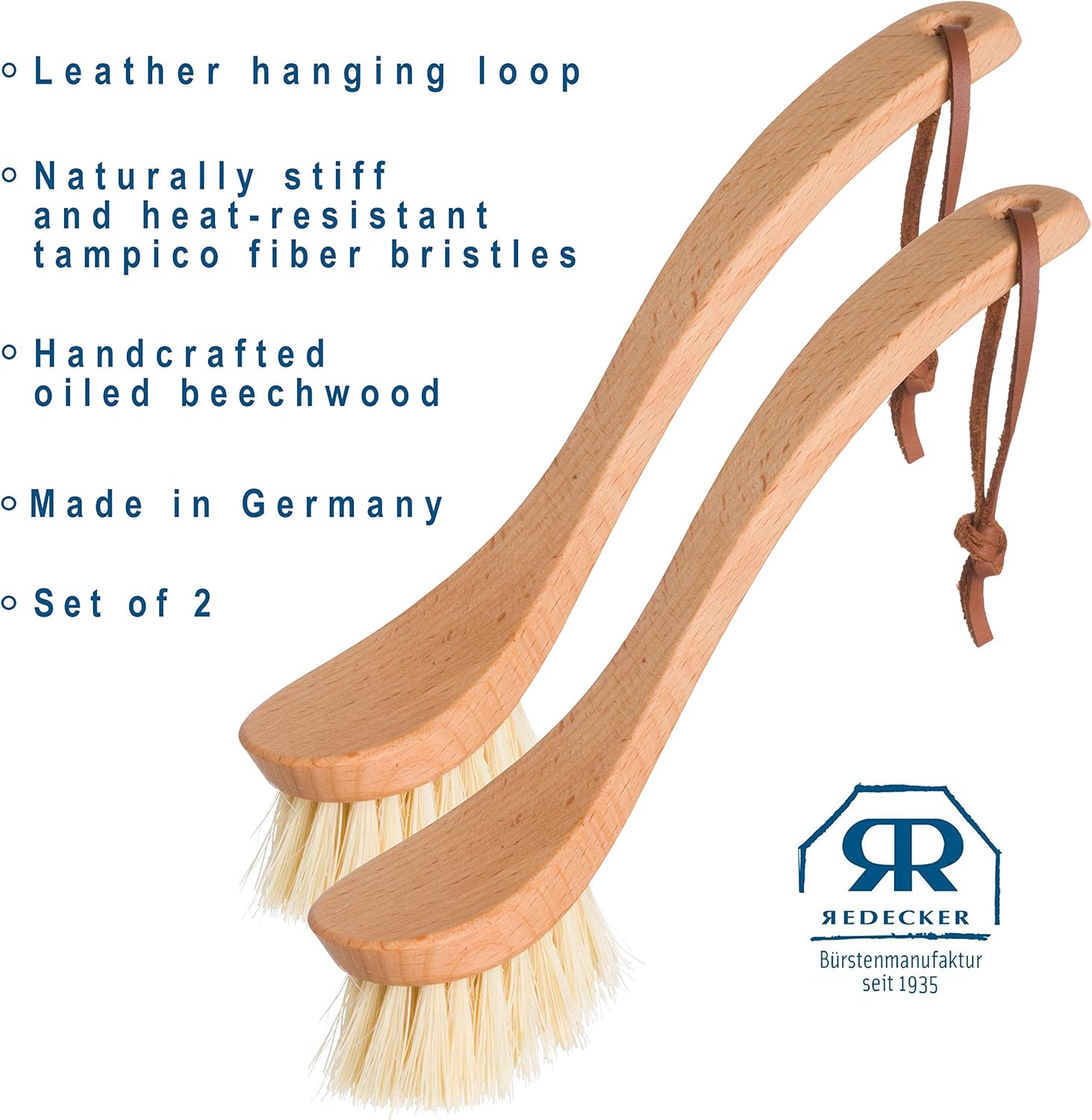 REDECKER Curved Dish Brush - Natural Tampico Fiber Bristles, Ergonomic Design with Oiled Beechwood Handle 9-1/4 inches, Set of 2 - Natural Bristle Kitchen Brush with Handle, Made in Germany