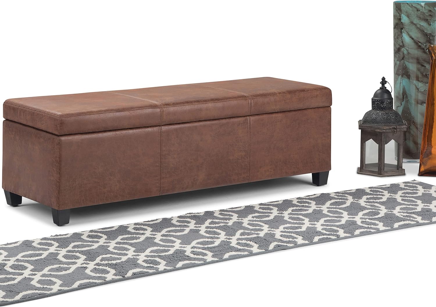 SIMPLIHOME Avalon 48 inch Wide Contemporary Rectangle Storage Ottoman Bench in Distressed Umber Brown Vegan Faux Leather, Assembled, For the Living Room, Entryway and Family Room