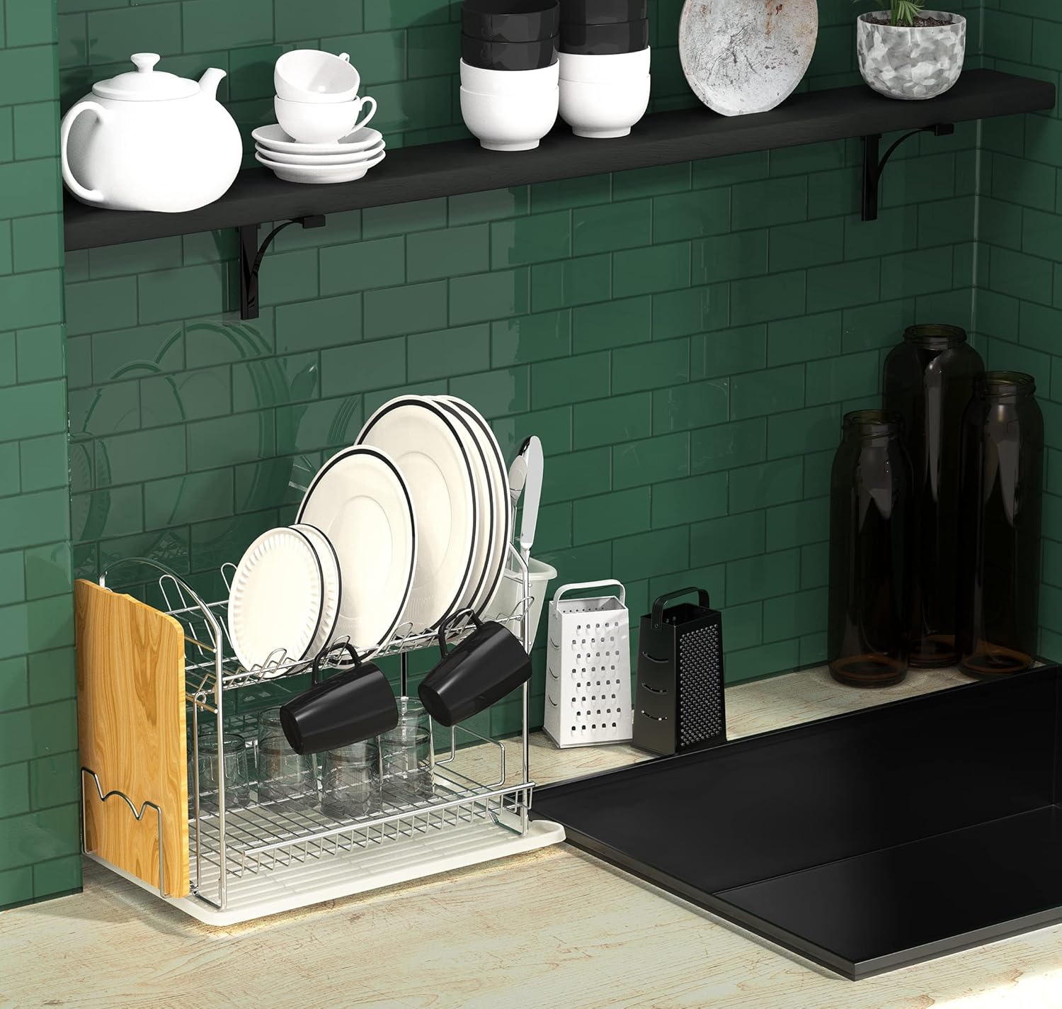 Simple Houseware 2-Tier Stainless Steel Dish Rack with Drainboard, Chrome for Kitchen