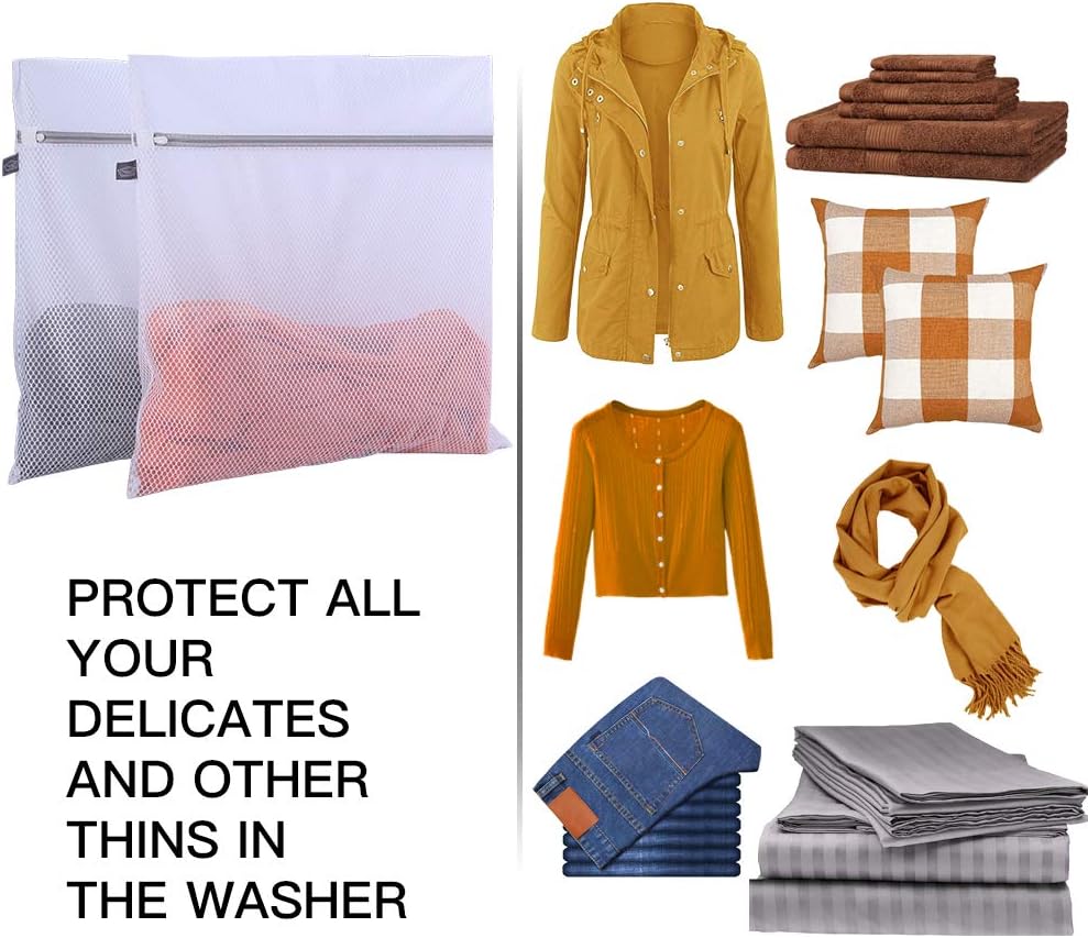 - 【Super Big Size】: Our extra large mesh wash bags is 2pcs 24 inches X 24 inches. This large washing bag can meet the washing needs of many people. It has large space, make washing more adequate , more clean. Suitable for washing Clothes, Jeans and other Large Clothing, As well as Bath Towels, Bed Sheets, Tablecloth, Curtains and other Household Items. Laundry bag