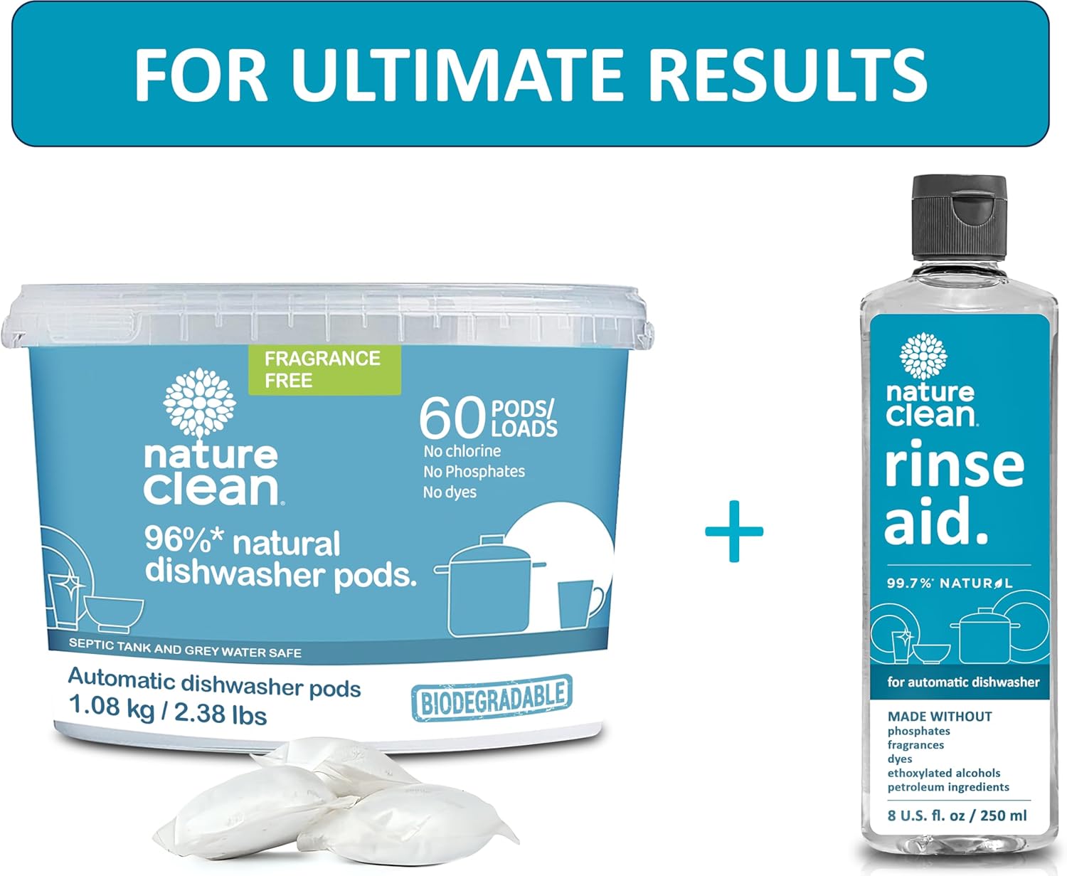- Natural Ingredients: Prioritize your family’s health with non-toxic Nature Clean rinse aid dishwasher cleaner made from 99.7% plant-based components; Free from phosphates, dyes, and fragrances, it offers a peace of mind with every wash