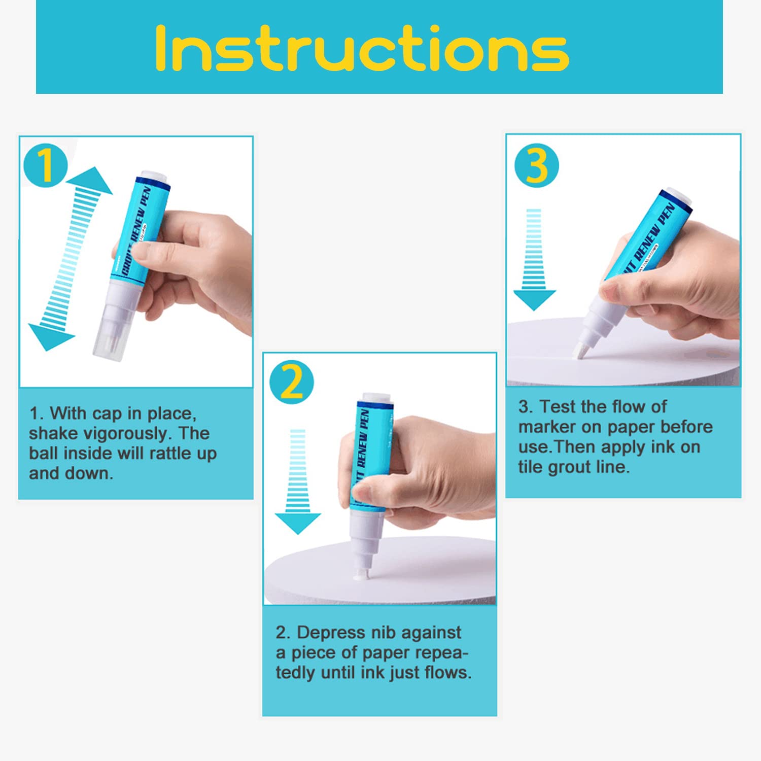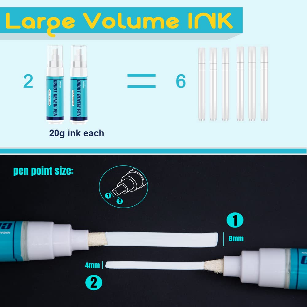 - 2 white grout renew pens, 20g / 0.7 oz ink each, up to 400 meters coverage for 2mm narrow grout line. Soft pen nib allows a smooth flow. Works both on walls and floors. Clean and restore tile grout and leaves them looking clean and protected.