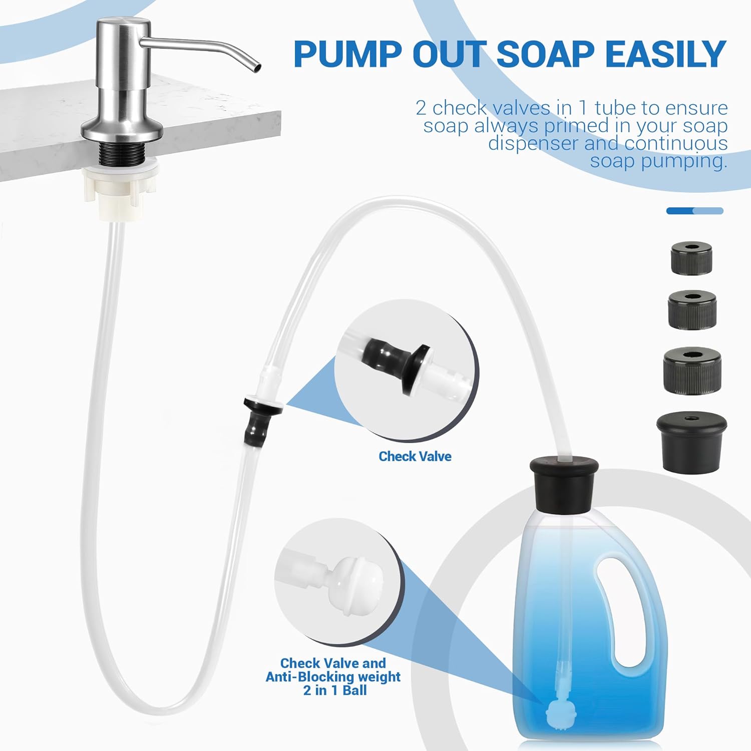 - WHAT YOU GET: 4 bottle caps to fit all bottles, a check valve,47" extension tube, anti-leak accessories, and 2 punch-free cable tie clips. NO KITCHEN SOAP DISPENSER INCLUDED.