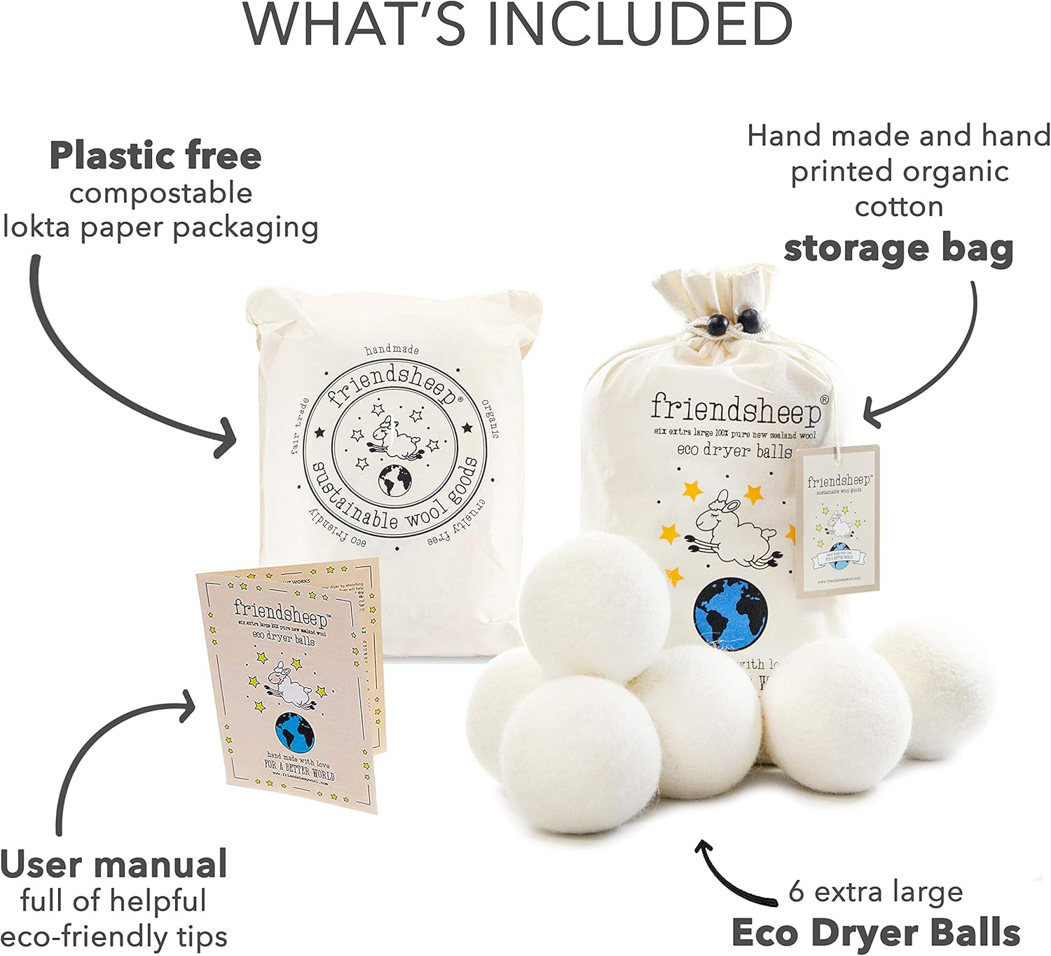Wool Dryer Balls by Friendsheep 6 Pack XL Organic Premium Reusable Cruelty Free Handmade Fair Trade No Lint Fabric Softener White - "Creamy White"