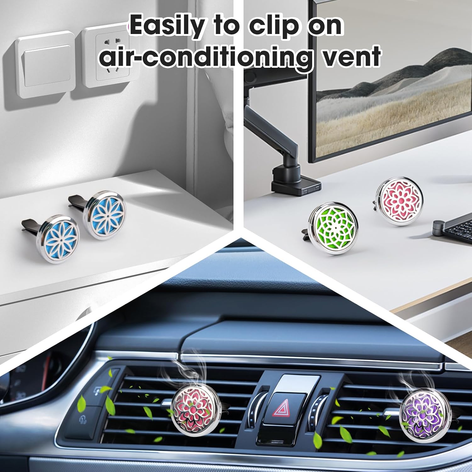 - 【Multipurpose】You can place the mini aromatherapy car oil diffuser vent clip any where you like such as your car, office, bathroom, or even inside a wardrobe, and etc. Stay away from the unpleasant smell and create a charming atmosphere. (Essential oils not included)