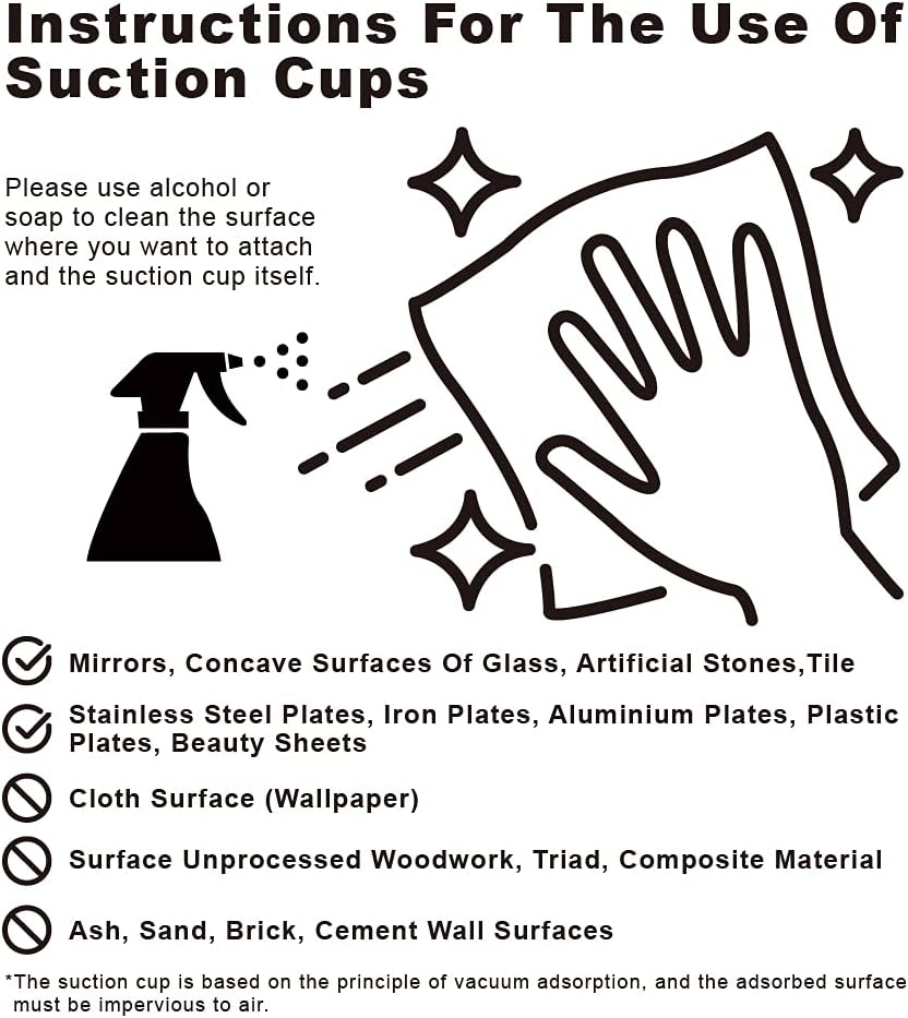 - Easy Tips for Better Suction If the suction cup isn’t sticking, try these: 1.Clean both the surface and suction cup with warm soapy water. 2.Soak suction cup in warm water for 1–2 minutes to soften. 3.Press suction cup head firmly to remove air bubbles. 4.Ensure installation on flat surfaces, not corners or curves.