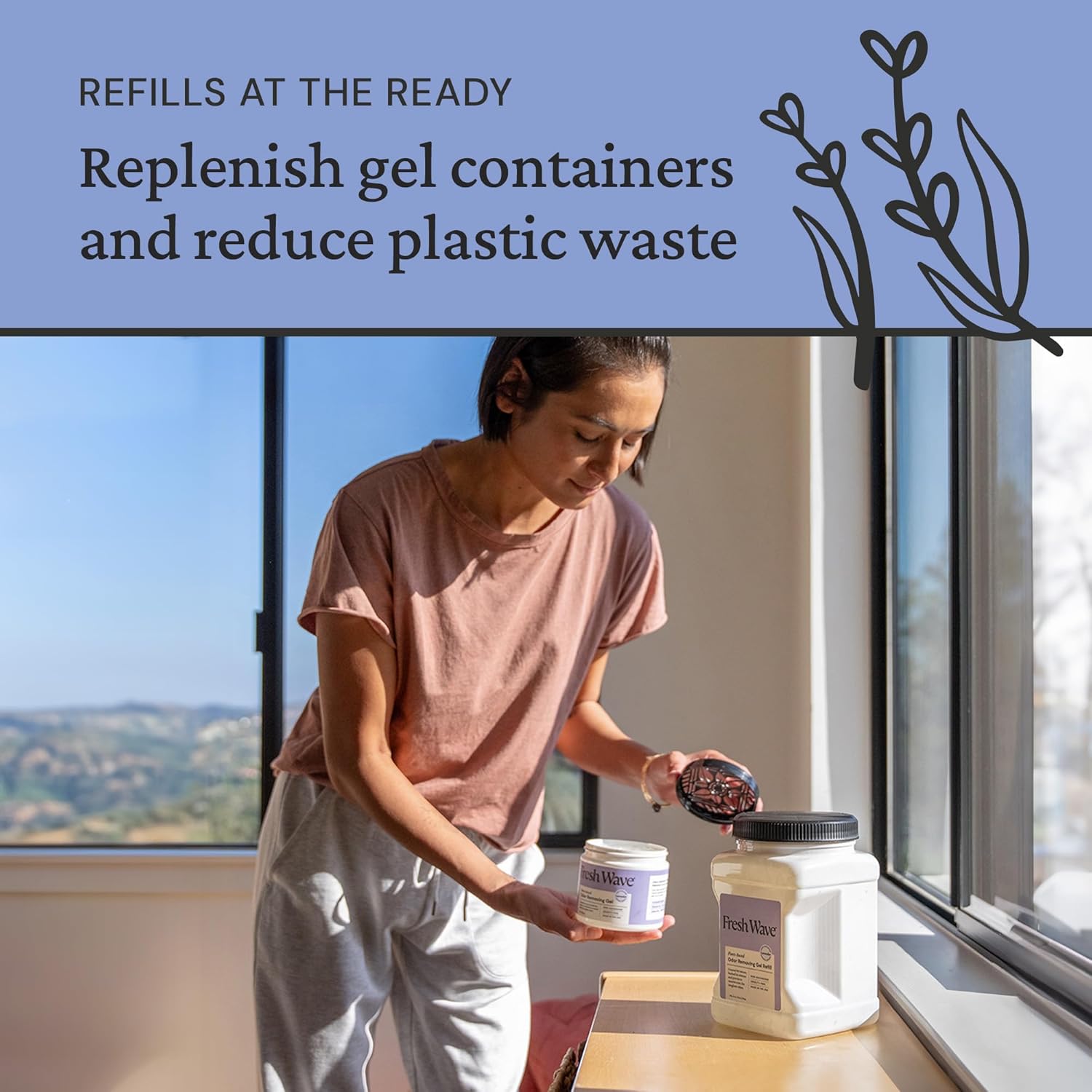 - Refill your Gel Jars and place wherever odors are strongest, like bathrooms, baby rooms, home gyms, and more.