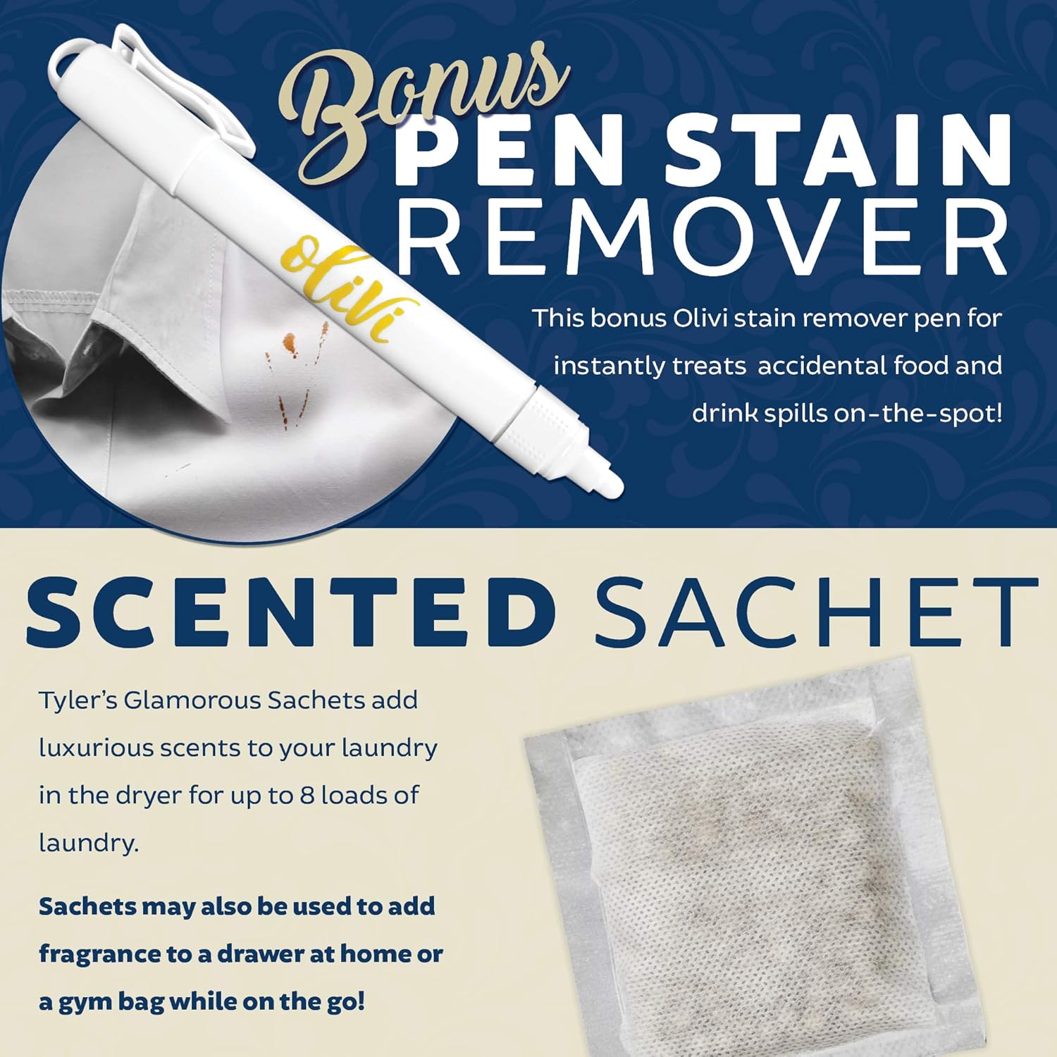 - BONUS OLIVI STAIN REMOVER PEN & SCENTED SACHET - We've made it easier than ever to keep your important items and everyday clothing clean, fresh and stain-free. Includes a FREE BONUS Olivi stain remover pen for instant on-the-spot treatment of accidental food and drink spills.
