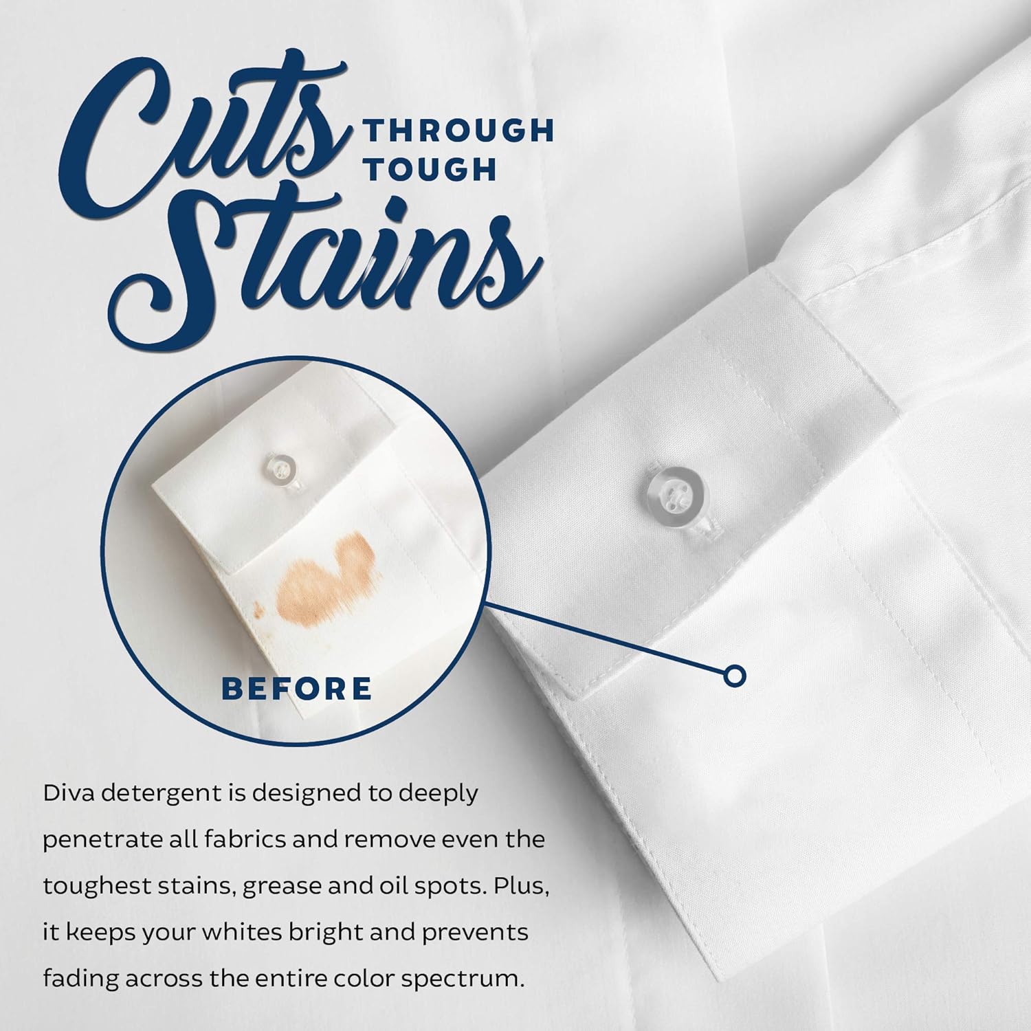 - ELIMINATES TOUGH STAINS - DIVA laundry detergent liquid is designed to clean all fabrics and remove even the toughest stains. For maximum effectiveness, pre-treat stains directly with detergent, then wash on Warm.