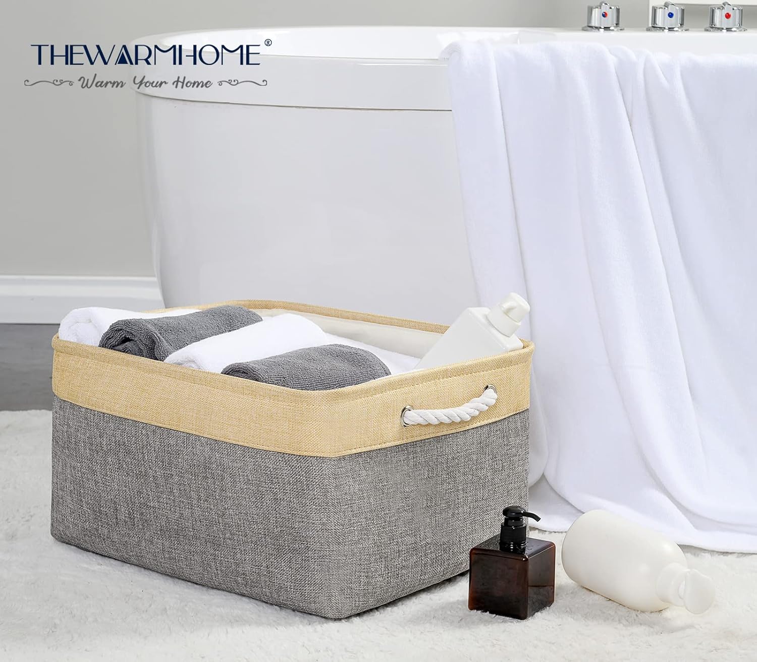 - 【ARTISTIC】: TheWarmHome Fabric Bins had great storage capacity and stylish. Minimalist design and neutral color exterior fabric can be integrated into any home decorations and styles. White cotton rope handles on the sides add a nature touch. The storage basket is like an art, not only provide a solution to many storage needs make home keep clean and tidy, doubles as a charming decoration. TheWarmHome, WARM YOUR HOME.