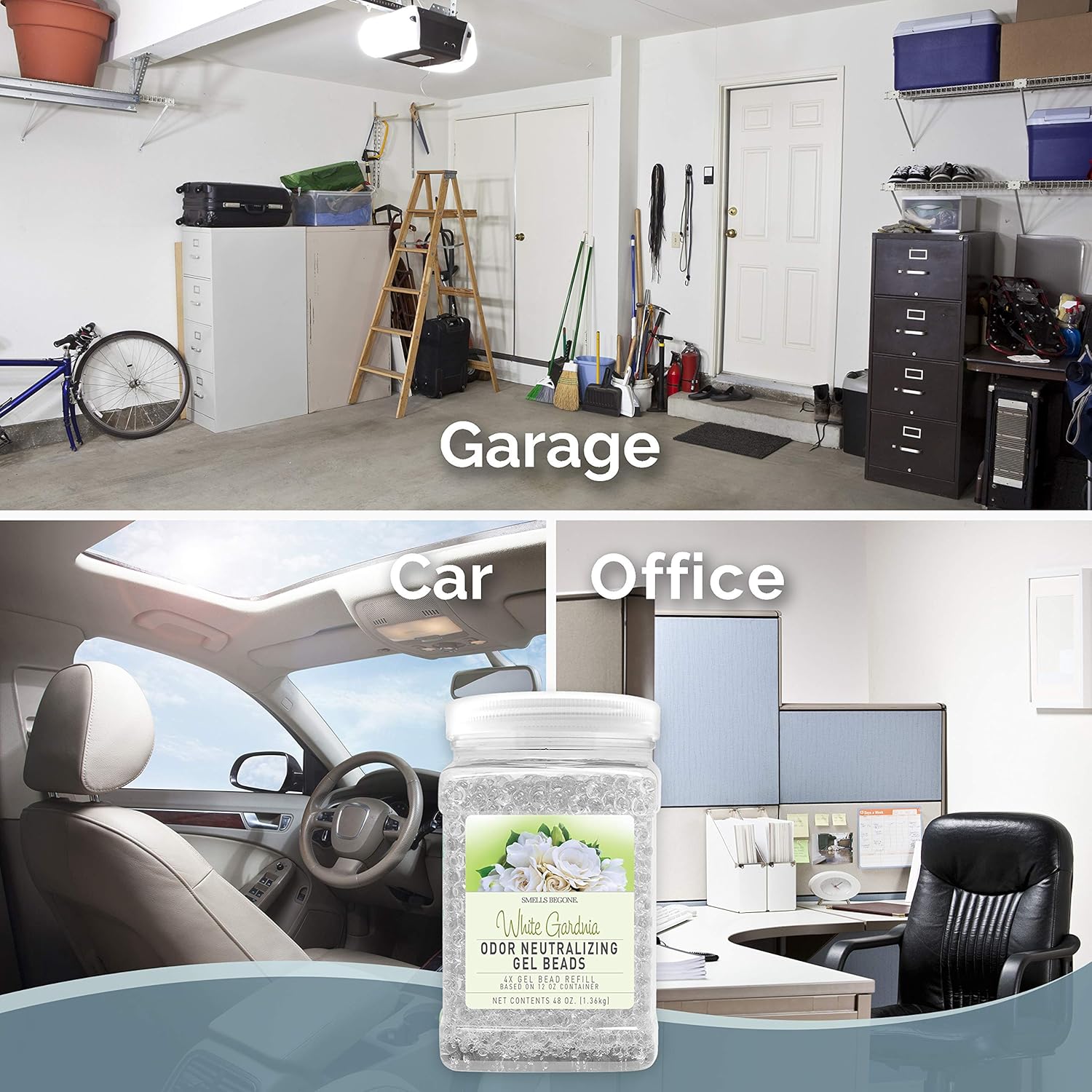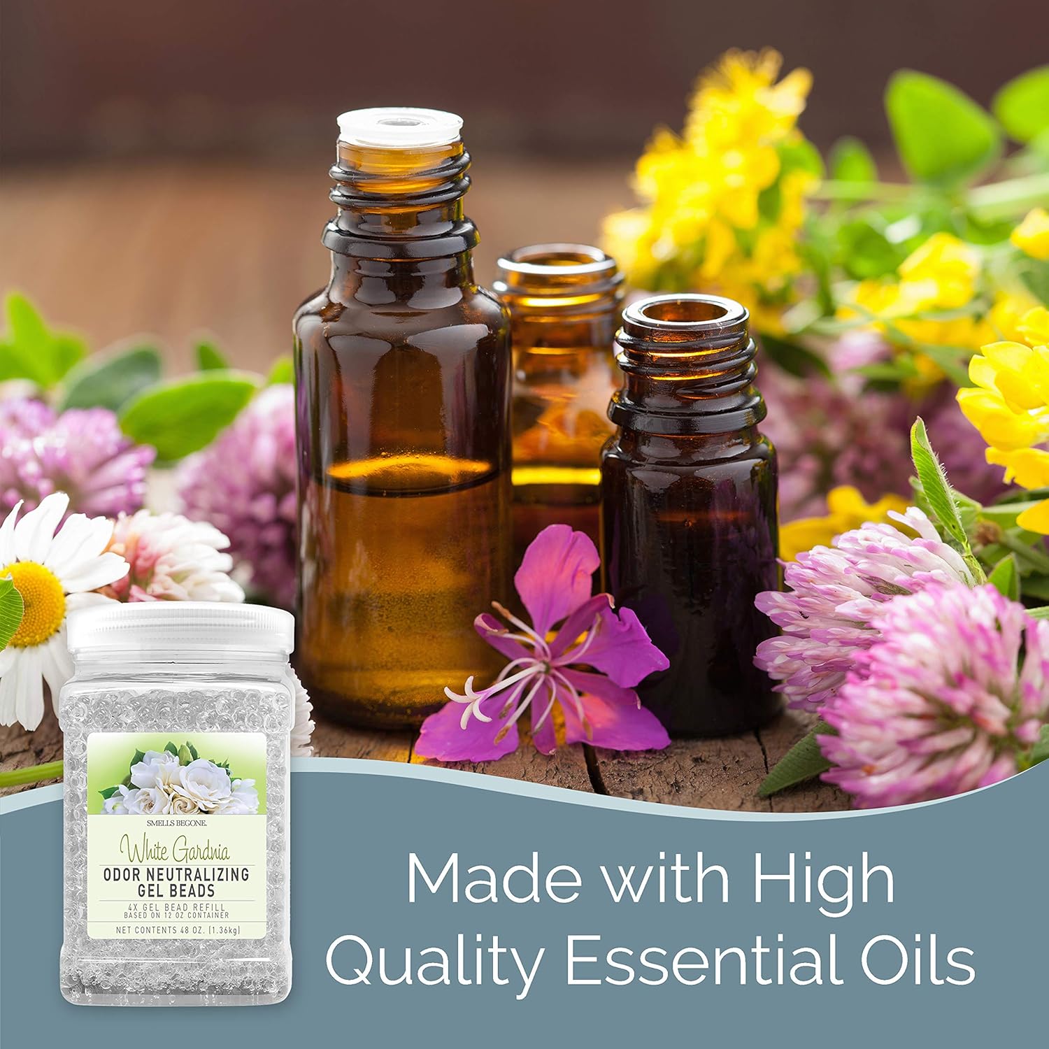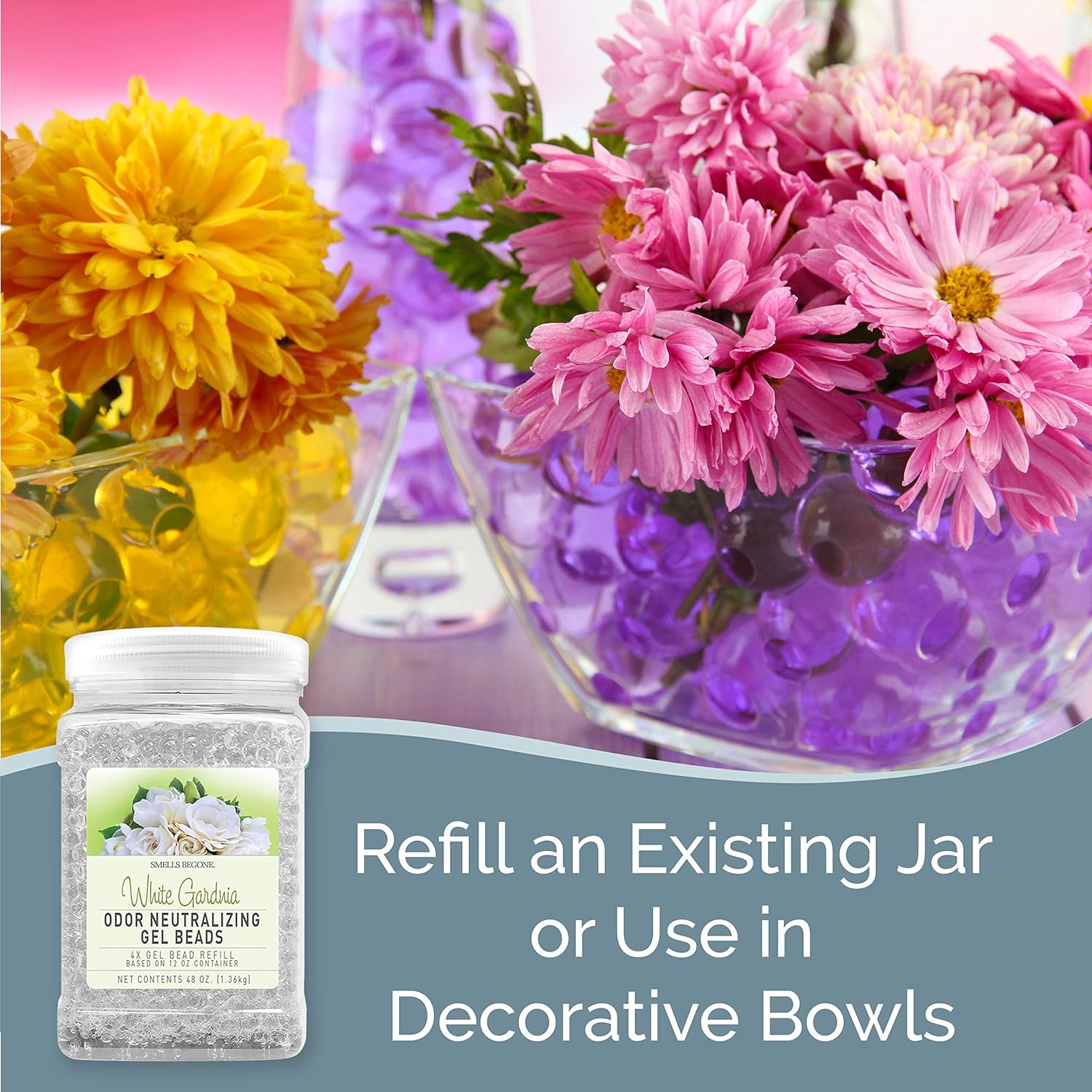 SMELLS BEGONE 48 oz Odor Eliminator Gel Bead Refill - Eliminates Odors from Bathrooms, Cars, Boats, RVs and Pet Areas - Air Freshener - Made with Essential Oils - White Gardenia Scent