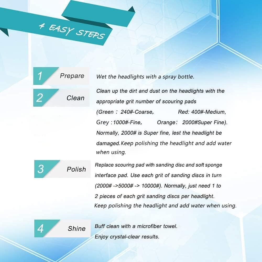 - 【EASY 4-STEP】Step 1 - Prepare a spray bottle of water and drill. Step 2 - Clean with scouring pads(P240 → P400 → P1000). Step 3 - Polish with sponge interface pad and sanding discs (P2000 → P5000 → P10000). Step 4 - Shine like a new one. Physical restoration with headlight restoration pads, without any chemical fluid, safe and environmental-friendly.