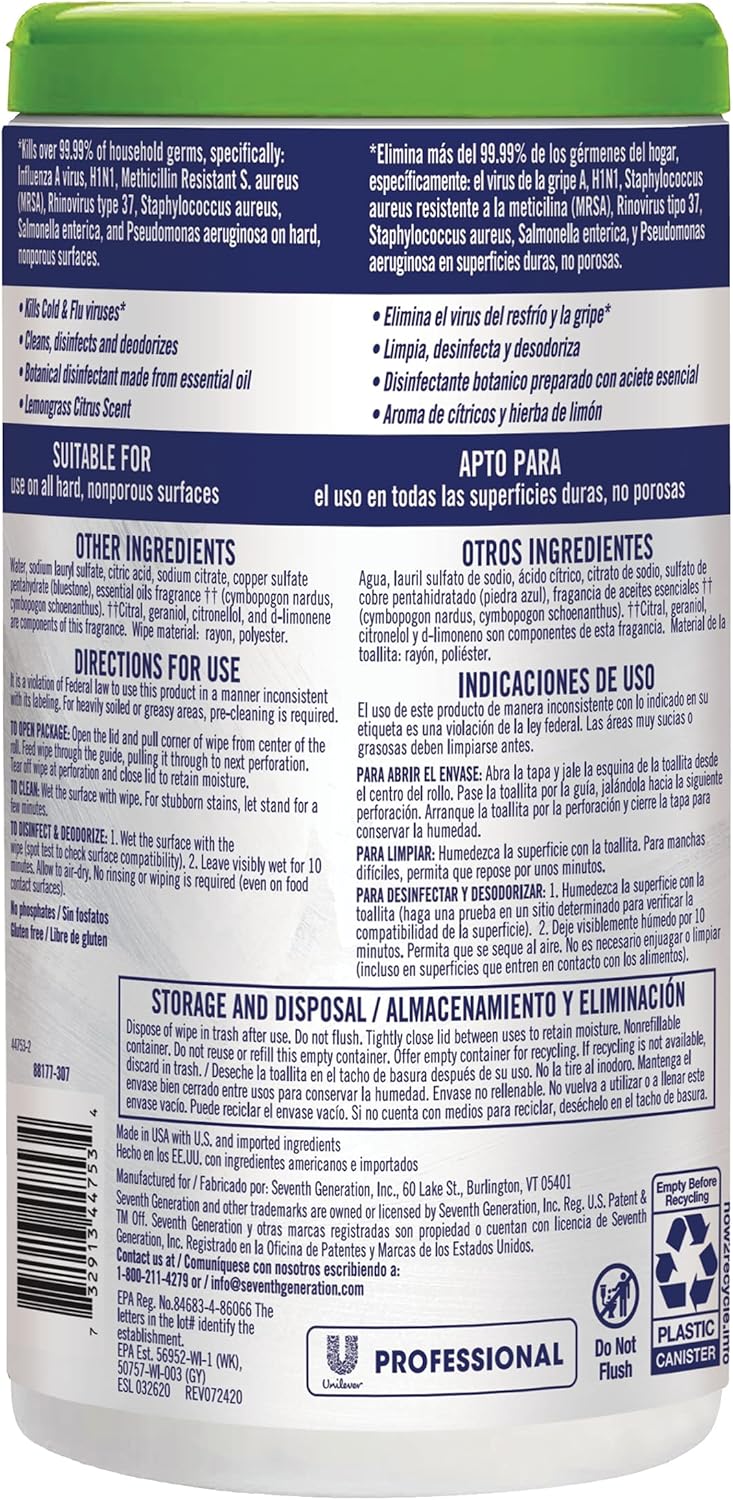 Seventh Generation Professional Disinfecting Multi Surface Wipes, Lemongrass Citrus, 70 count Tubs (Pack of 6)