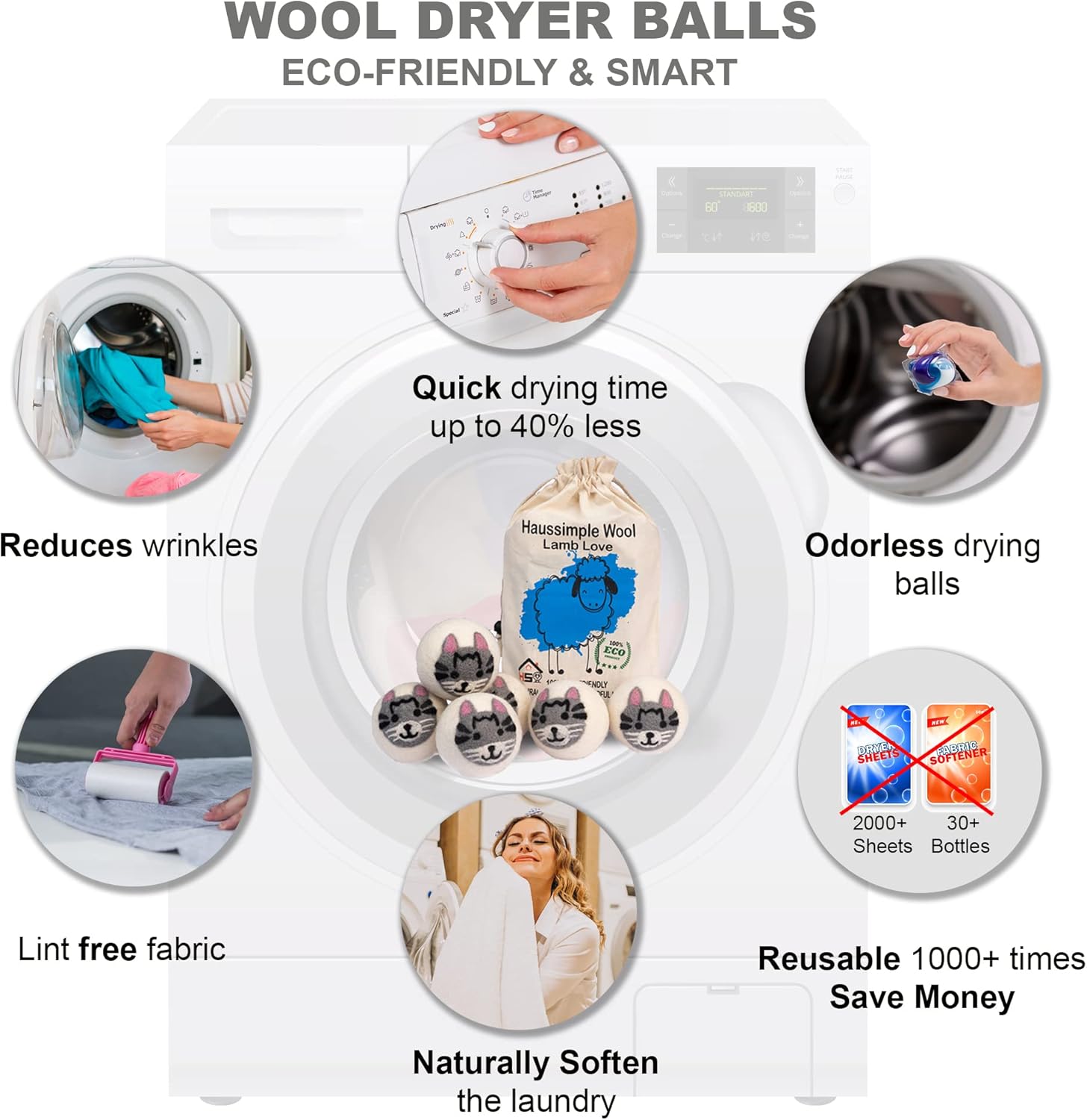 Wool Dryer Balls Organic Felt 6 Pack Laundry Fabric Softener, Extra Large Reusable Handmade Natural Sheep Wool Lint Wrinkle Free Anti Static Baby Safe (Cat)