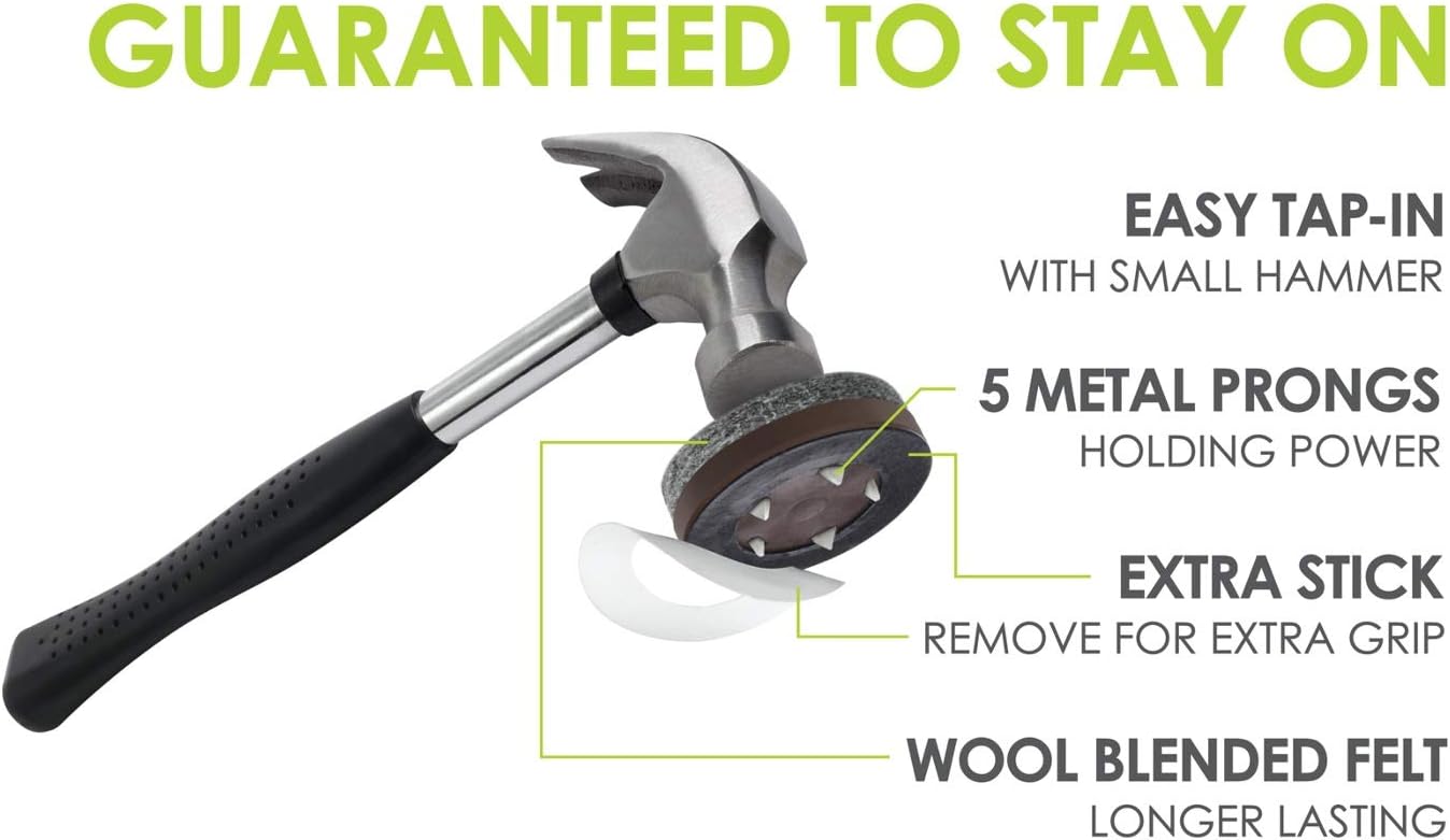 - Felt pads guaranteed to stay on furniture legs – Each tap in 1-1/2 inch felt furniture glide features 5 steel prongs paired with a strong self-stick adhesive backing that hangs on and will not come off chair legs or furniture feet. Not for use on metal furniture legs. Premium furniture pads designed to stay on and last longer than other felt pads.