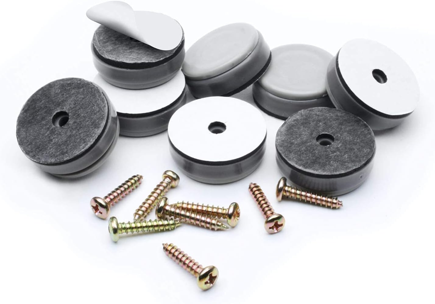 - Screw on self-stick attachment sliders - Includes 8 x 1.25” round x 0.5" height furniture glides which feature strong adhesive backings for quick attachment and 8 screws for secure attachment. If sliding on tile or carpet we recommend screwing furniture glides into furniture legs.