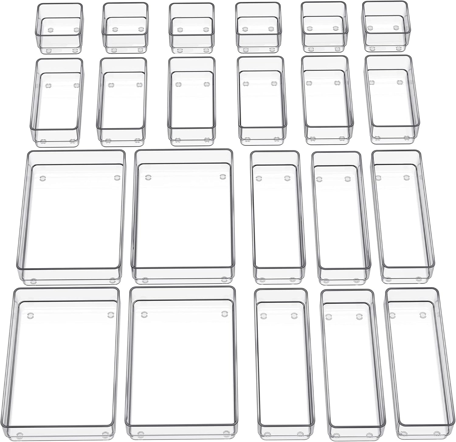 - 4 Different Sizes: One set includes 22 pcs storage bins in 4 different sizes offer you customize combinations to store stuff and organize drawer for your specific needs. Size: 8.9 x 5.9 x 1.9 inches (4 packs), 8.9 x 3.0 x 1.9 inches(6 packs), 5.9 x 3.0 x 1.9 inches(6 packs), 3.0 x 3.0 x 1.9 inches(6 packs).