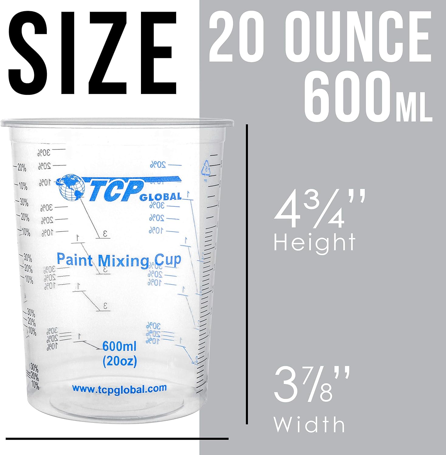TCP Global 20 oz. (600ml) Graduated Plastic Mixing Cups - Box of 25 with 25 Mixing Sticks - Disposable Plastic Measuring Cups for Liquids, Paints, Resin, Epoxy, Art, Kitchen - Ratios 2-1, 3-1, 4-1 ML