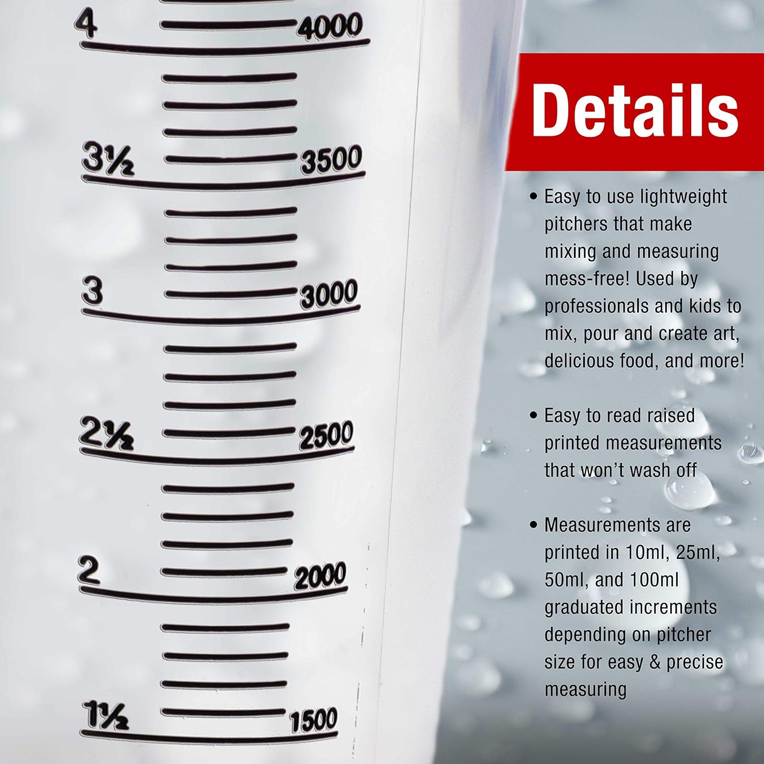 - Easy to use lightweight pitchers that make mixing, measuring, and pouring mess-free! Used by professionals and kids to mix, pour and create art, delicious food, and more.