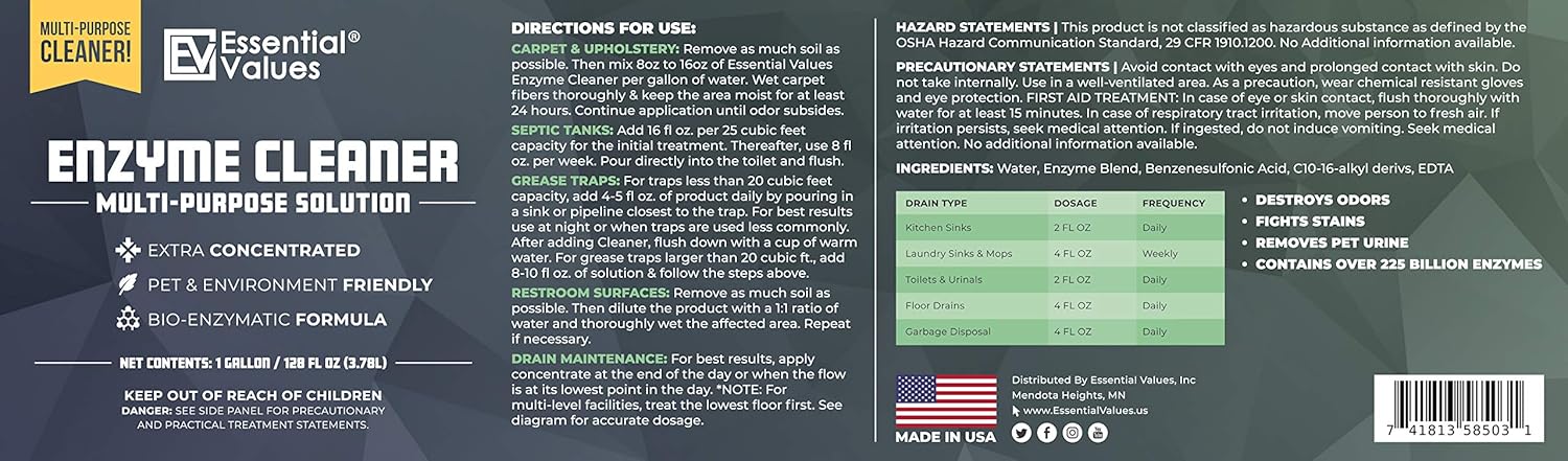 - Great Value: The Essential Values Enzyme Cleaner (Gallon/128 FL OZ) is a non-corrosive, non-flammable, non-acid, and cost-effective cleaner for your everyday cleaning needs, eliminating odors at the source.