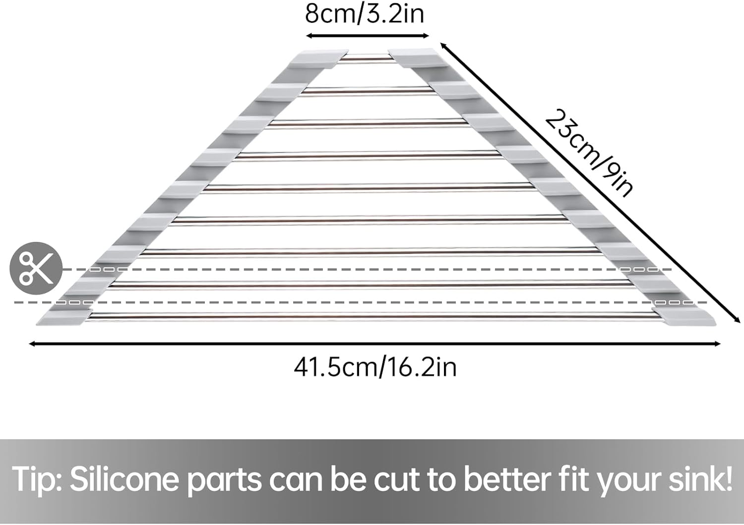 - ✔️【Customizable Size】Tailored to optimize your kitchen sink corner space with a triangular design. Too big? Simply use scissors to cut the silicone sides for a perfect fit. It's a handy tool that allows you to easily rinse and dry small items to keep your kitchen clean. Ideal for accommodating sponges, brushes, hand soap, dishes and more. Bottom Length: 16.2”, Side Length: 9”, Upper Length: 3.2”.