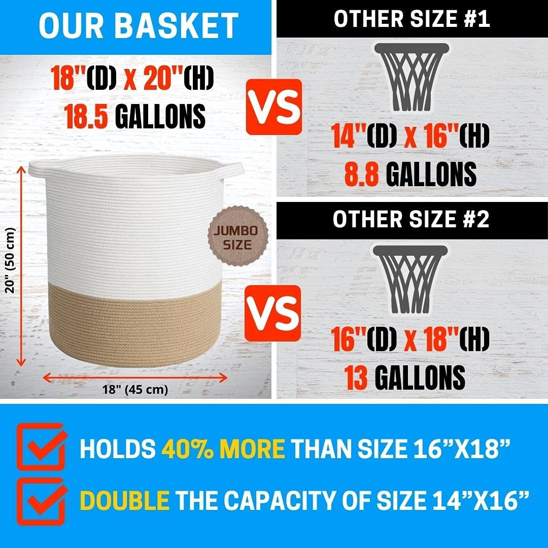 - Extra Large Jumbo Size 20" x 18" Cotton Rope Storage Baskets - Big enough to store bulky items like extra blankets, comforters, duvets, throw pillows, cushions, and stuffed animals, winter clothing, laundry, and more. It offers plenty of space for smaller miscellaneous items too, like books, and magazines, to keep your living space neat and tidy!