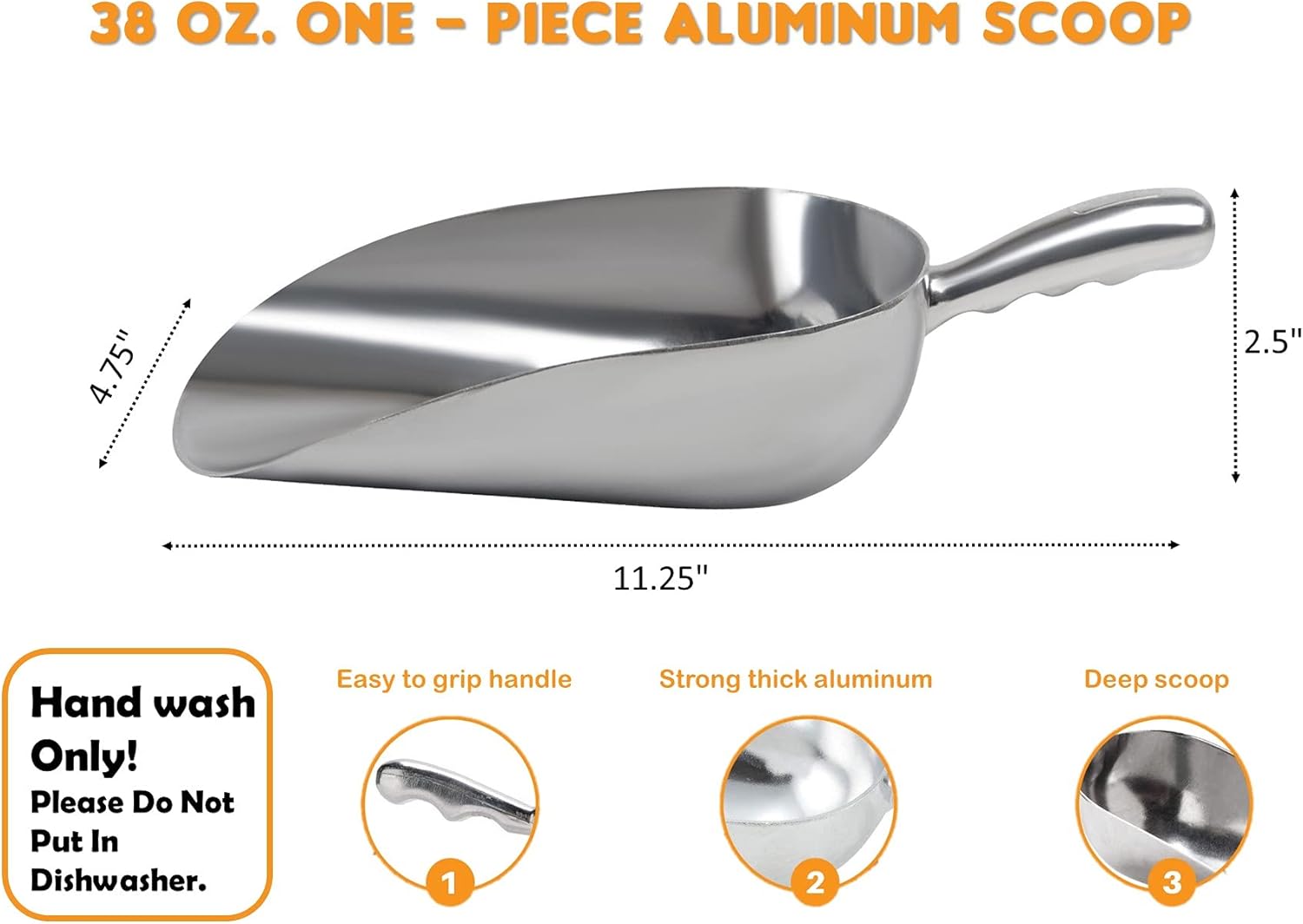Cast Aluminum Utility Scoop - 38 oz. - Round Bottom, ice scoop For Multi-Purpose Use, With Finger Groove Handle (38 oz.)