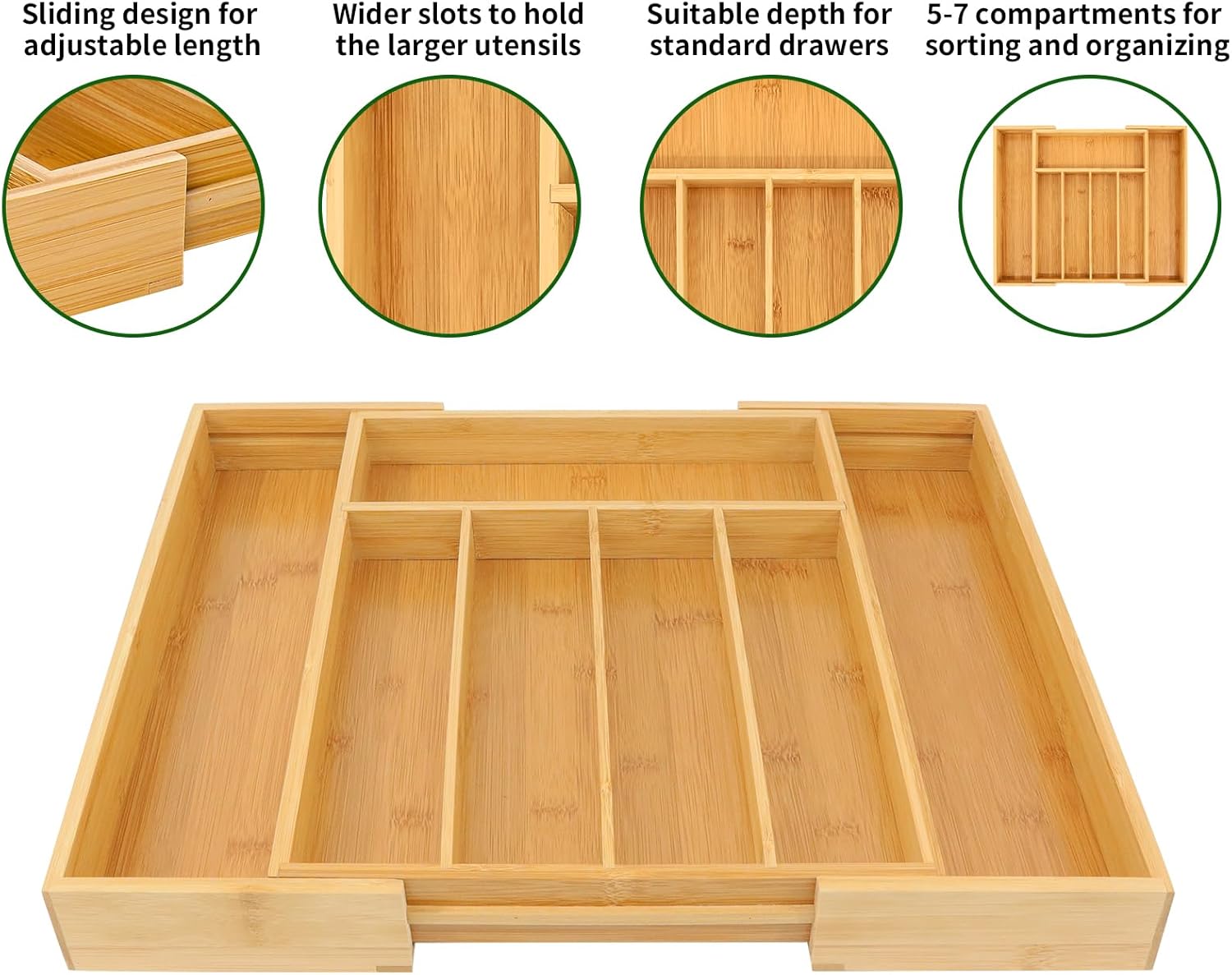 - Upgrade Your Kitchen Display: Hold your kitchen utensils, knives, spatulas, spoons and forks invisible in drawer; This wood silverware drawer organizer has 5-7 compartments and provides enough space to place utensils