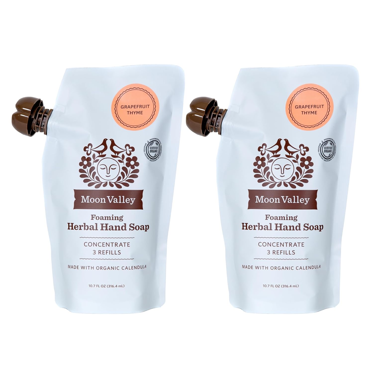 - REFILL PACK: This is a bundle of two 10.7oz Grapefruit Thyme Refill Pouches for Moon Valley foaming hand soap dispensers. Each pouch comes with enough concentrate to refill a standard recyclable dispenser three times. Unlike liquid soap, this concentrate is formulated for foaming dispensers.