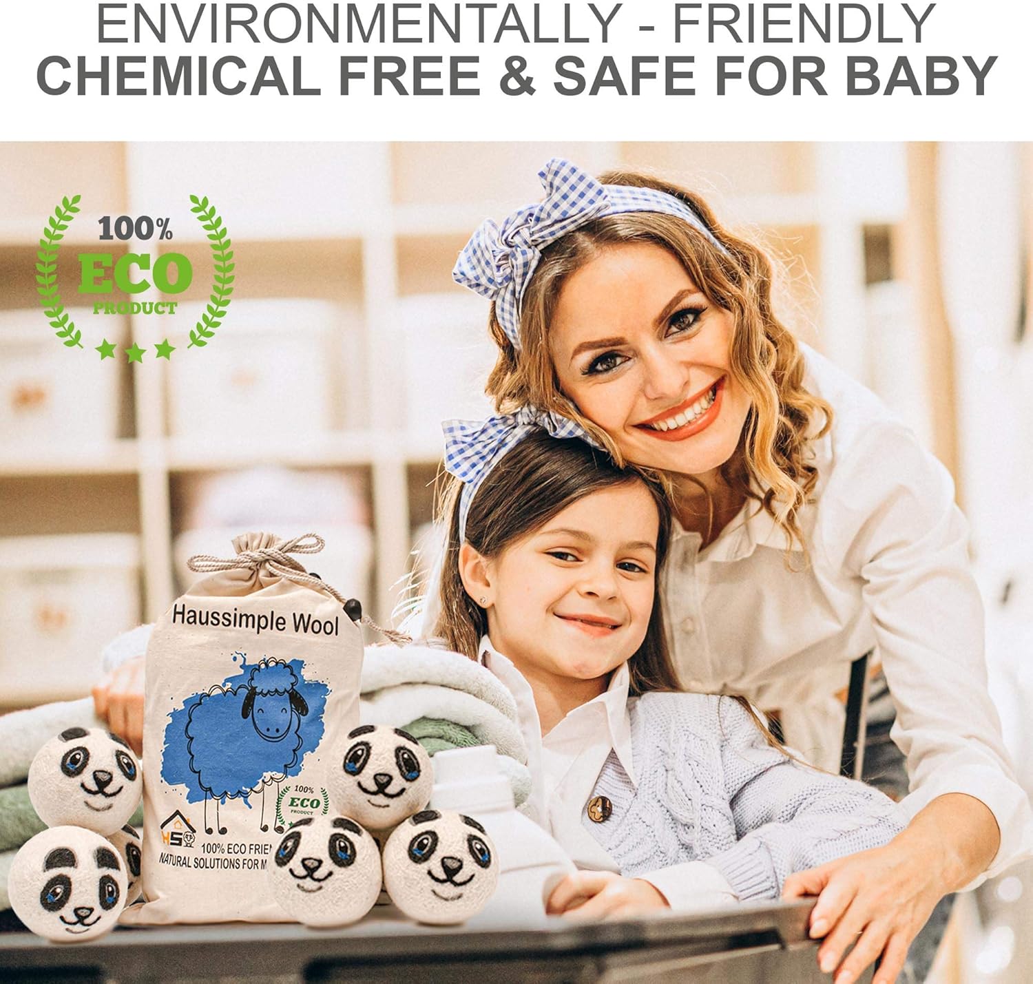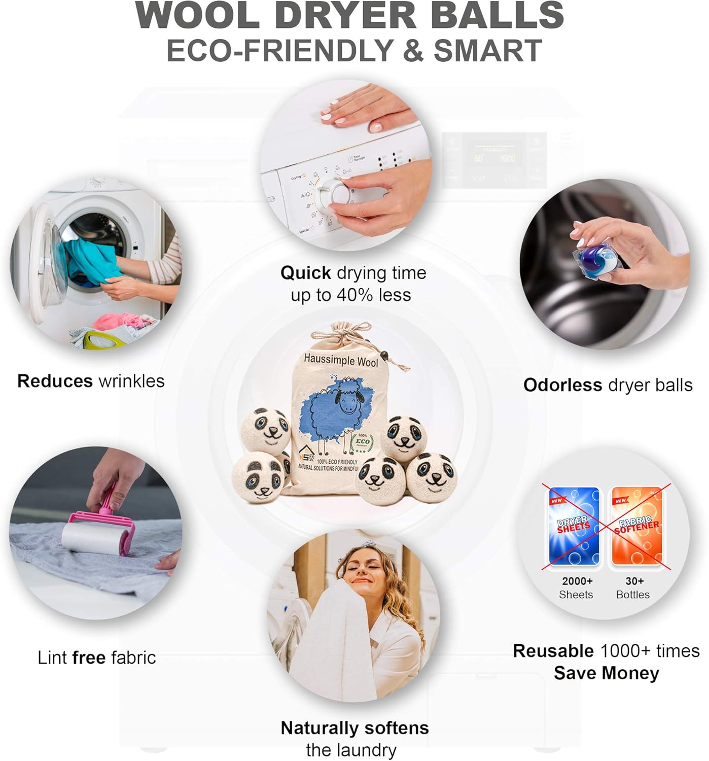 Wool Dryer Balls Organic Felt 6 Pack Laundry Fabric Softener, Extra Large Reusable Handmade Natural Sheep Wool Lint Wrinkle Free Anti Static Baby Safe (Panda)