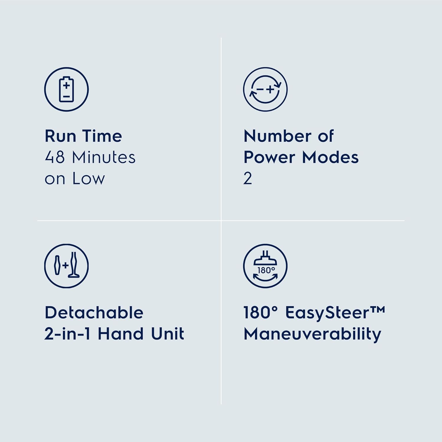 - Cordless Cleaning with Extended Power: Enjoy up to 48 minutes* of run time with the Turbo Power HD lithium battery, while the LED charge indicator conveniently lets you know when it’s time to recharge your Electrolux vacuum