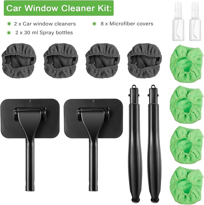 - Package included: you will receive 2 sets car window tools for cleaning , and each set consists of 1 piece detachable handles, 1 piece 30 ml spray bottle, 1 piece car cleaning scraper, 4 pieces reusable microfiber bonnets, the ample quantity to meet your to use and replacement needs, you can share them with others in daily life; Easy to install: Align large post with large hole and small post with small hole. Gently bend the head until both posts snap into place — minimal flexing required