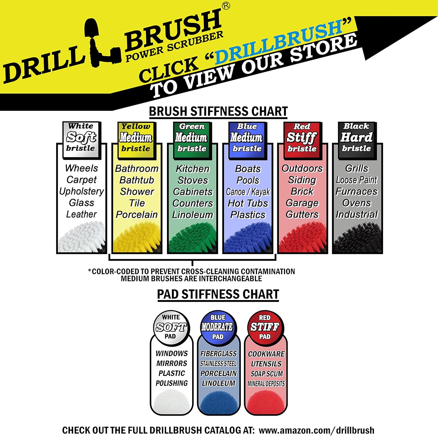 - Kitchen Cleaning Pad Brush Set: This set includes 7 cleaning brushes for drills in our medium green stiffness to insure you have the size to turn your drill into a kitchen cleaner machine. This kit also includes 4 different types of pads, our white soft, moderate red, stiff blue, and soft foam to insure you have the right stiffness to tackle even glassware cleaning needs. Our best-selling original bullet shaped brush is great for contours and crevices. The 2-inch flat great for smaller spaces.