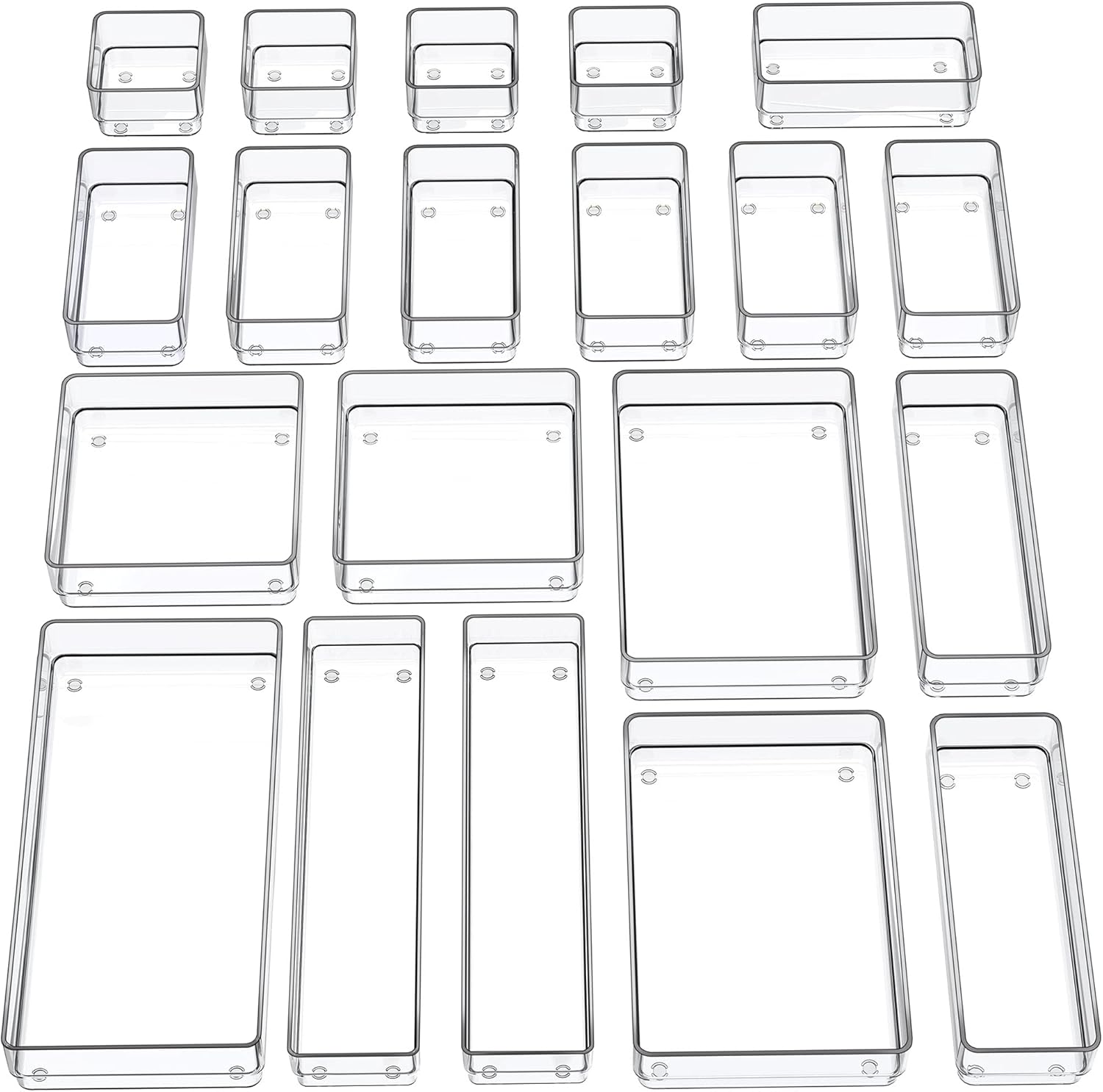 SMARTAKE 20-Piece Drawer Organizer with Non-Slip Silicone Pads, 7-Size Desk Drawer Organizer Trays Storage Tray for Makeup, Jewelries, Utensils in Bedroom Dresser, Office and Kitchen (Clear)