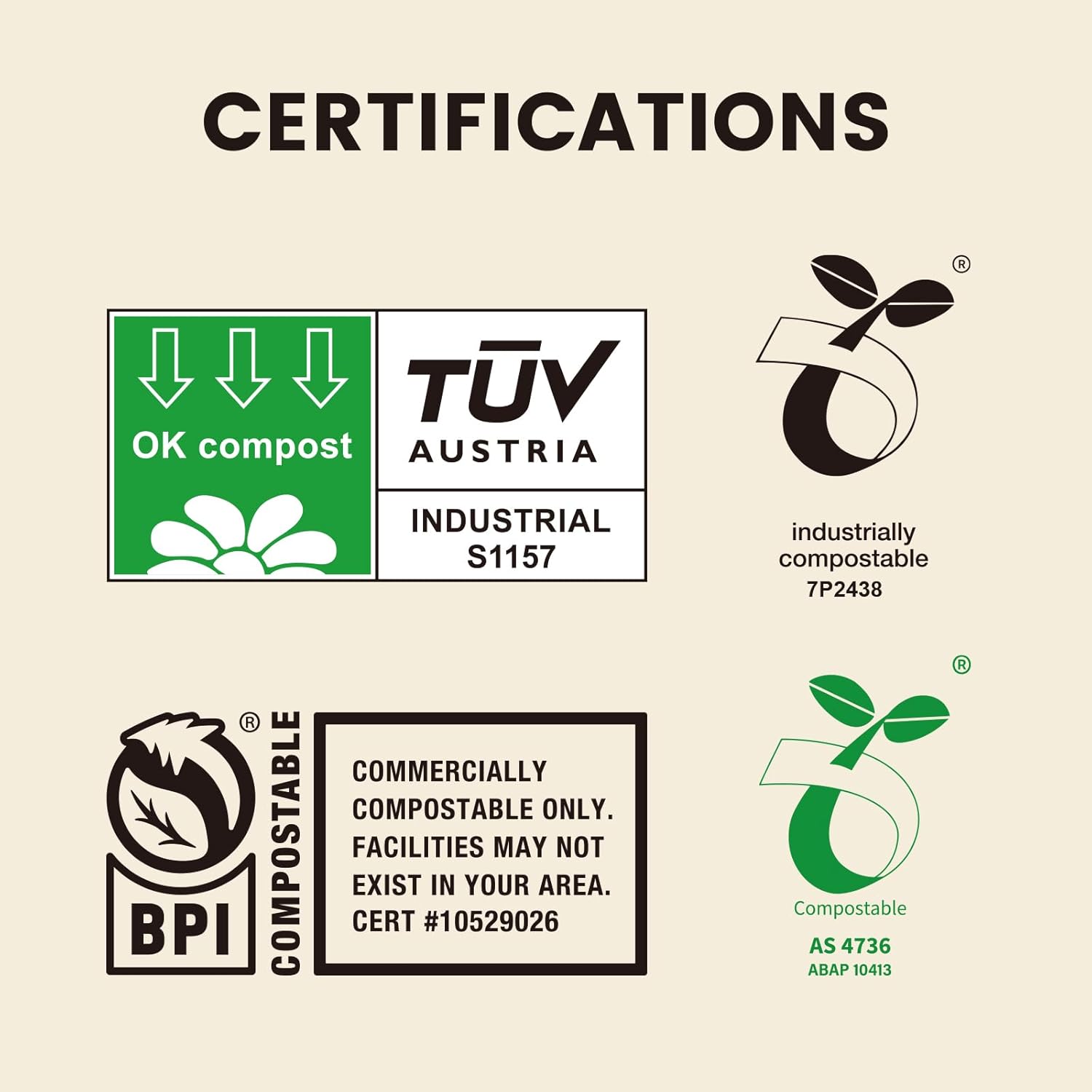 - CERTIFICATIONS: SUPERBIO bags has been awarded official certificates from Biodegradable Products Institute (BPI) (Commercially Compostable Only) and OK compost INDUSTRIAL, SEEDLING from TUV, meeting both the ASTM D6400 standard and the EN 13432 standard.