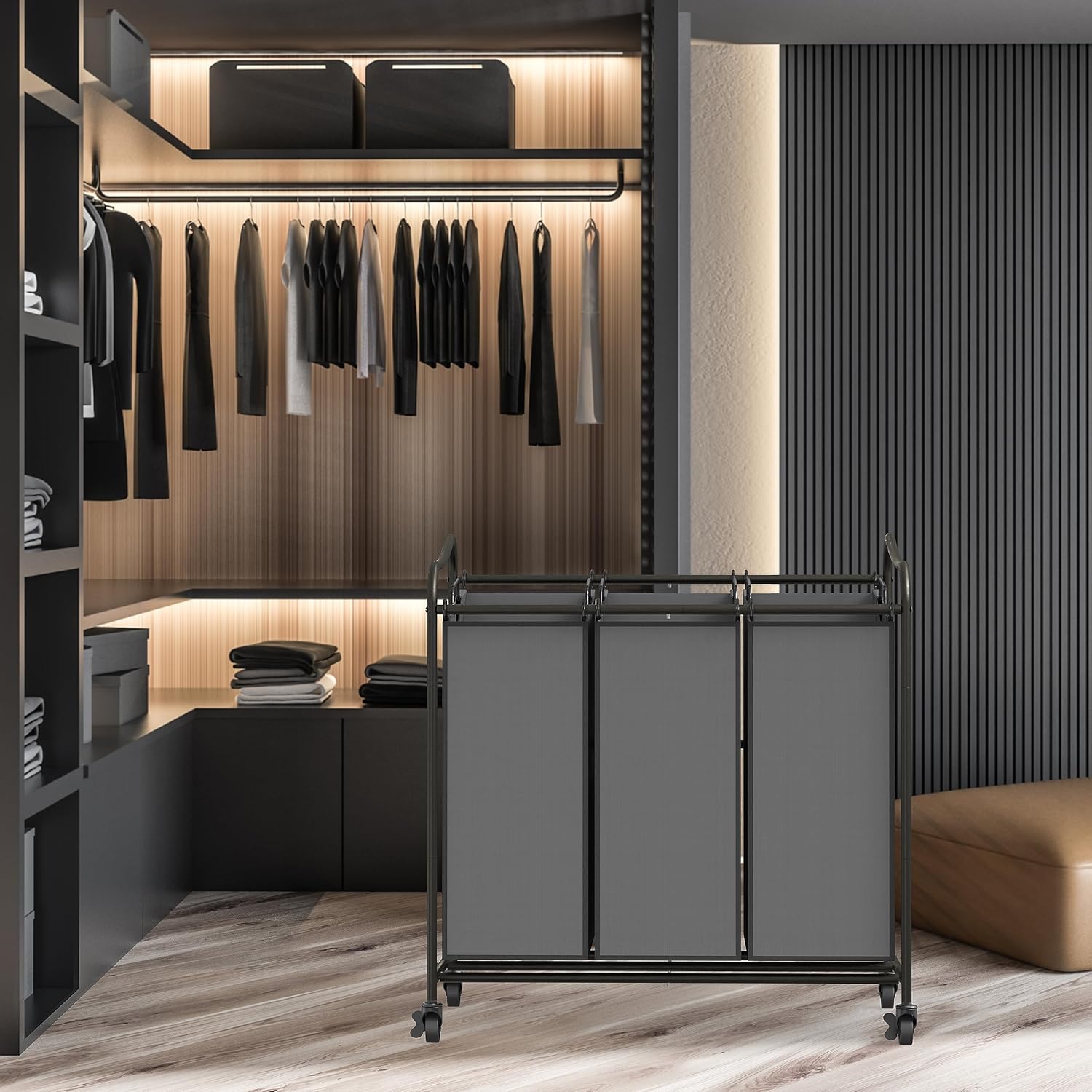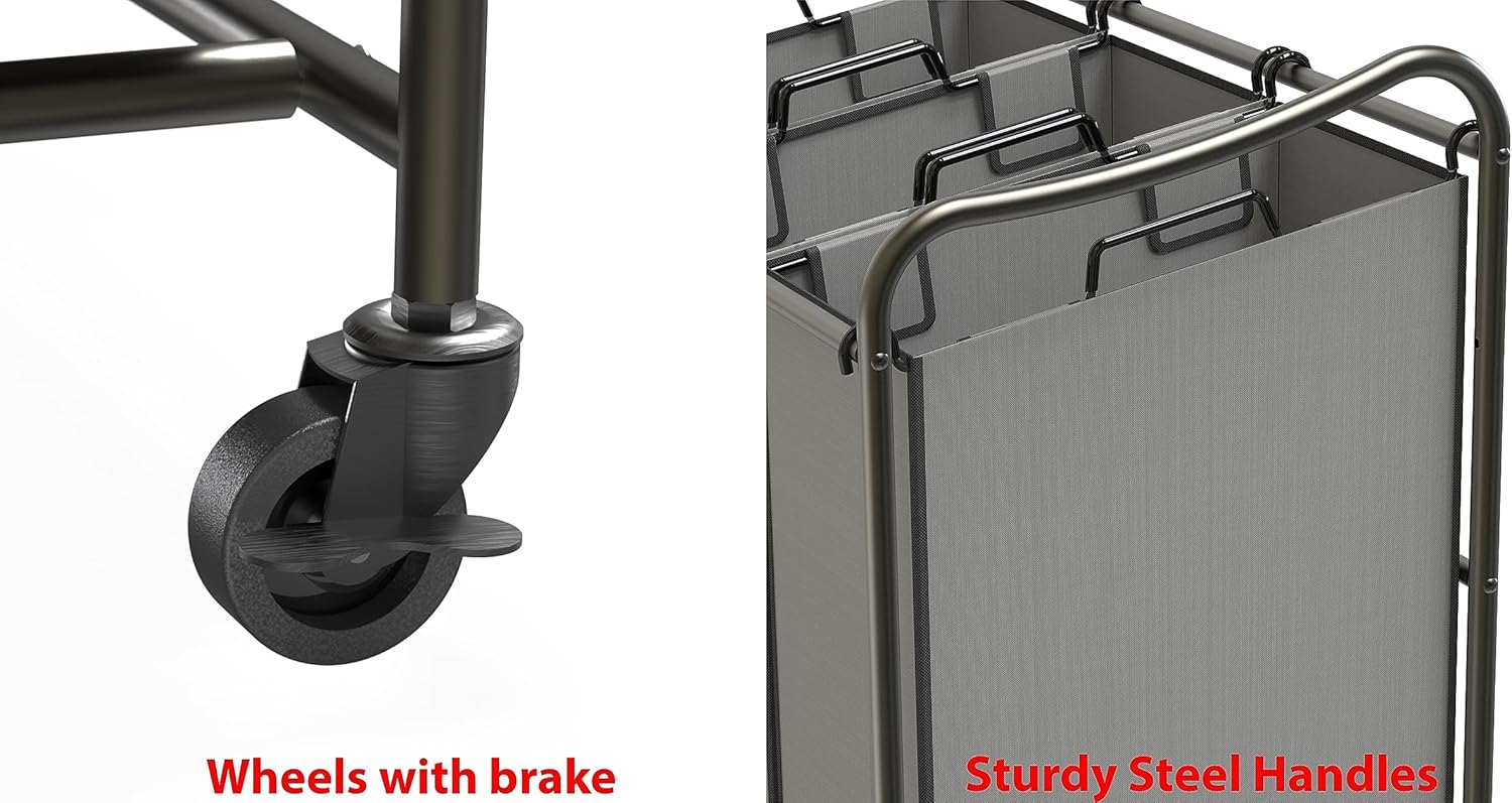 Simple Houseware Heavy Duty 3-Bag Laundry Sorter Rolling Cart, Dark Grey – Durable Triple Laundry Hamper with Removable Bags and Lockable Wheels for Efficient Laundry Organization