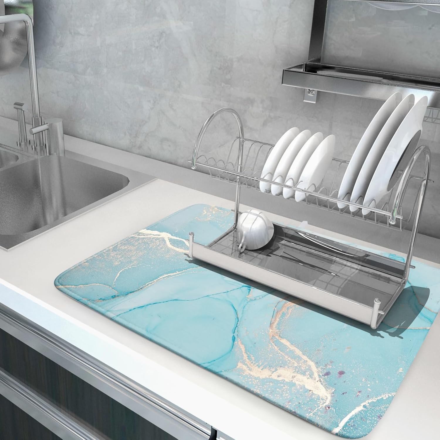 - 【Excellent Absorbent Performance】Premium absorbent Polyester surface and thick Sponge cushion make this Turquoise Glod Marble dish drying mat quick drying. At the same time, it can protect your kitchen counter ,coffee bar or sink from scratching by the tableware.