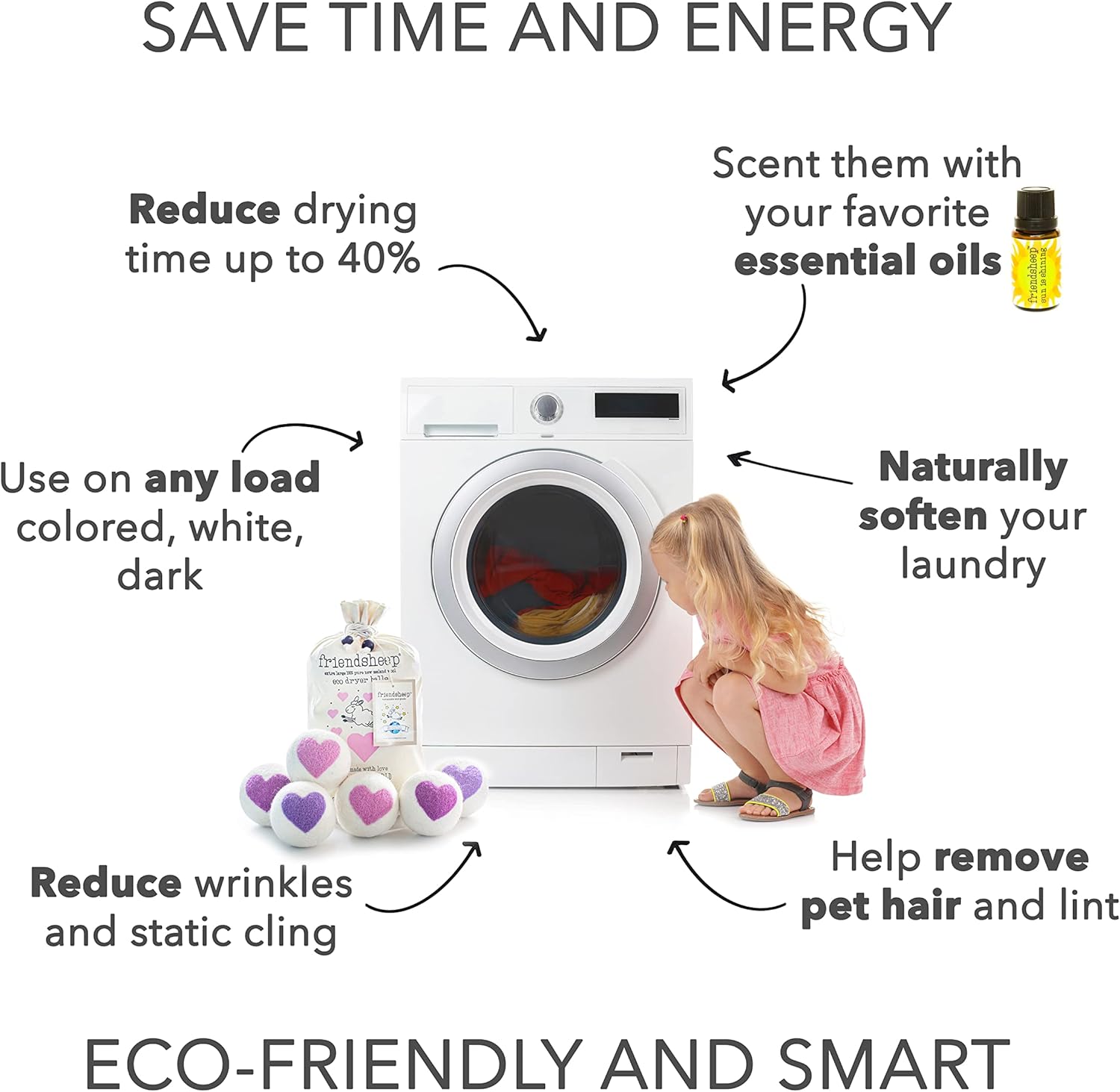 Friendsheep Organic Wool Dryer Balls Pink Purple Hearts 6 Pack XL Premium Reusable Cruelty Free Handmade Fair Trade No Lint Fabric Softener - Lovely Day