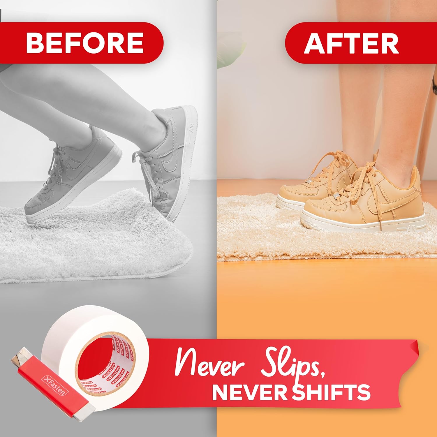 - SECURE & HEAVY DUTY ADHESION – Trust our double sided carpet tape heavy duty to KEEP RUGS, CARPETS, AND RUNNERS FIRMLY IN PLACE as a non slip rug grip tape or carpet holders alternative. Built with MAX ADHESIVE STRENGTH, our double sided tape for rugs holds tight on hardwood, tile, laminate, and carpet to carpet applications without sliding or curling making carpets and rugs anti slip.