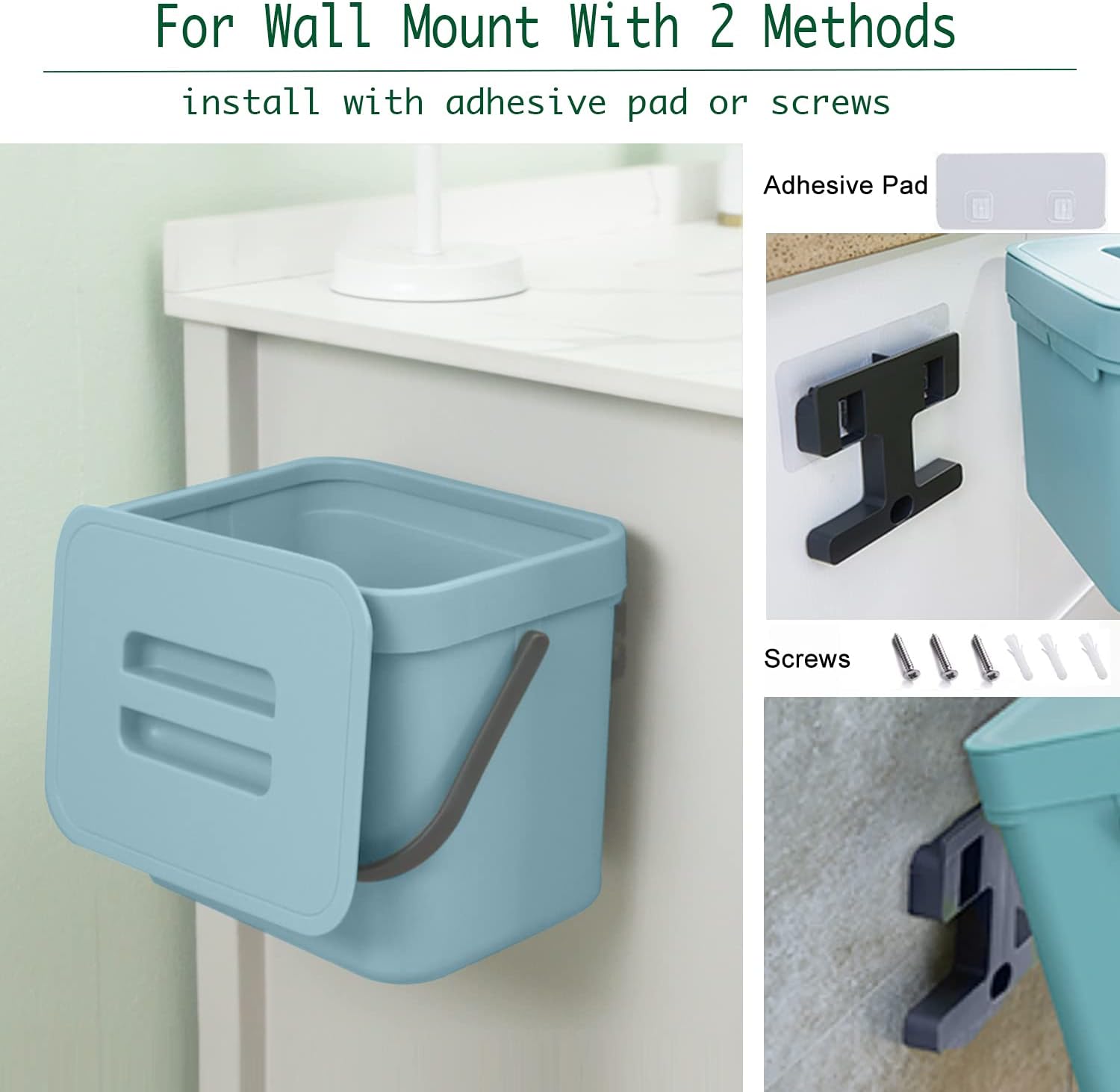 - Wall Mount/Under Sink/Countertop Trash Can: The small trash can with lid can be easily hung on kitchen cabinet doors, pantry doors. (The thickness of the door should be less than 0.86 inch) Moreover, this food waste caddy can also be wall-mounted to under sinks, cupboard, kitchen wall or bathroom wall with adhesive pad or screws.