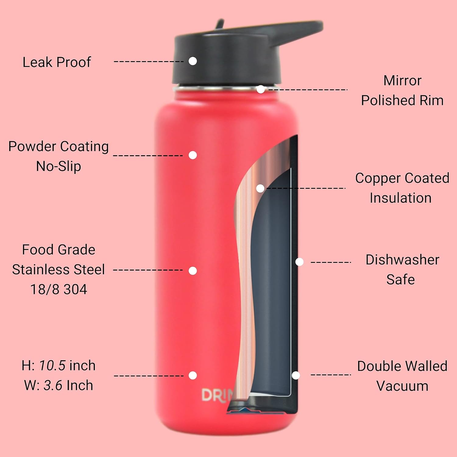 DRINCO Stainless Steel Water Bottle Spout Lid Vacuum Insulated Double Wall Water Bottle Wide Mouth (40oz 32oz 22oz 18oz 14oz) Leak Proof Keeps Cold or Hot (32 oz, 32oz Barn Red)
