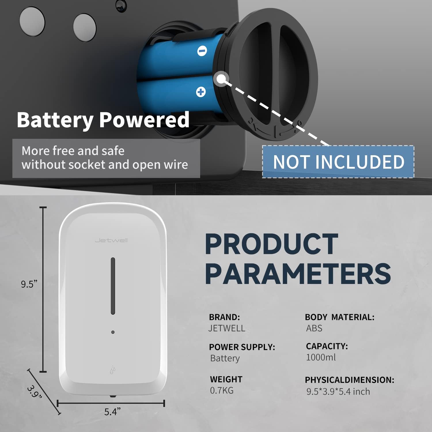 JETWELL Automatic Touch-Less Wall Mount Hand Soap Dispenser Liquid Drop Battery Operated, White Plastic Cover Large Capacity 34OZ/1000ML for Kitchen Home Commercial Bathroom
