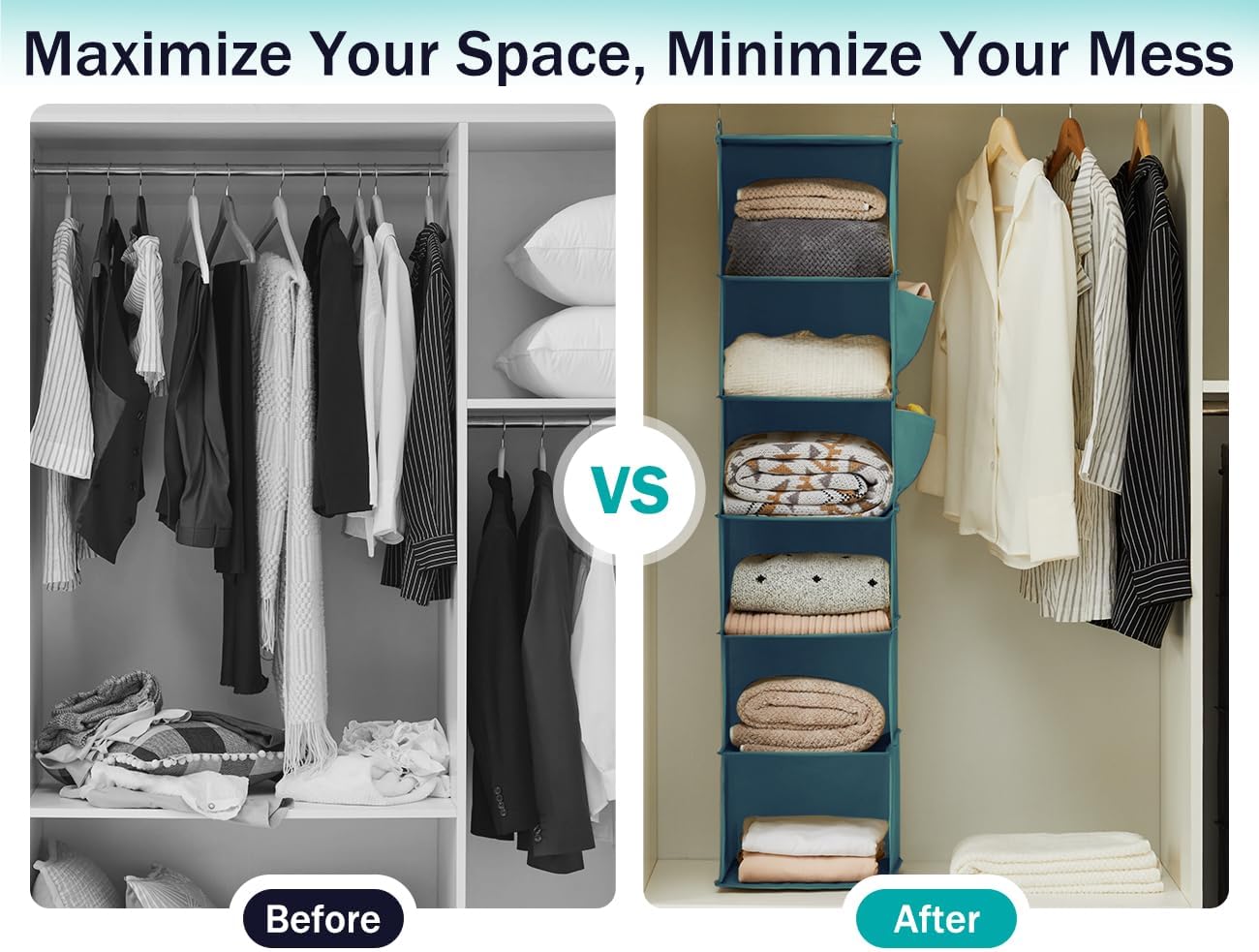 - 【Suitable】: Our closet hanging storage solution allows you to optimize your closet space. With six shelf units, it is perfect for individuals in need of additional storage but lacking sufficient closet space. It also offers an efficient space utilization option for those seeking to maximize their storage capacity.