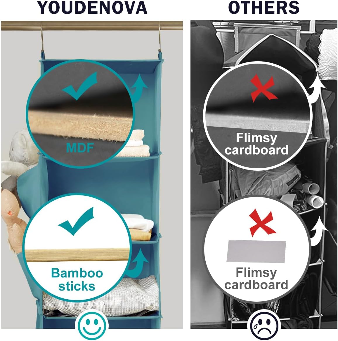 - 【High Quality】: Our hanging closet organizer is crafted from durable and thick non-woven fabric, ensuring long-lasting use. Unlike similar products, it features 2 sturdy bamboo sticks at each shelf and MDF board at the top and bottom, effectively preventing the compartments from bending.