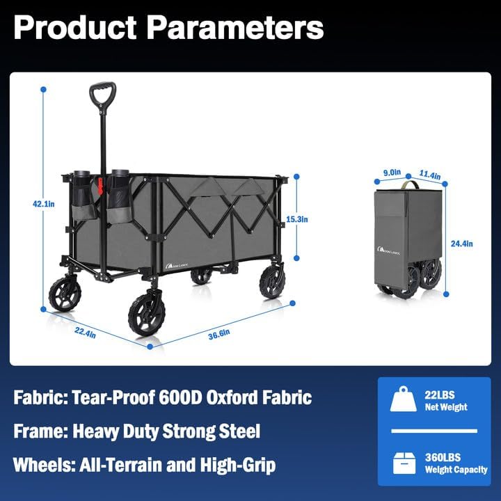 - Compact Storage: Fully open, the foldable wagon measures 42.1" x 36.6" x 22.4"; when folded, it’s just 24.4" x 14.4" x 9", saving over 80% of space. Lightweight at 22 lbs with two convenient cup holders, this wagon cart fits easily in the trunk or at home